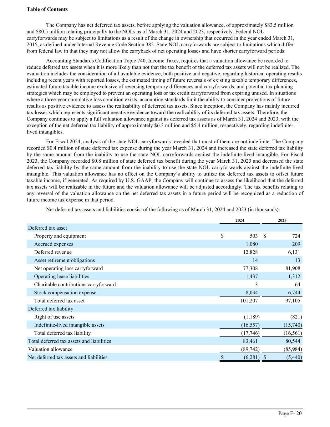 The Company has net deferred tax assets, before applying the valuation allowance, of approximately $83.5 million and $80.5 million relating principally to the NOLs as of March 31, 2024 and 2023, respectively. Federal NOL carryforwards may be subject to limitations as a result of the change in ownership that occurred in the year ended March 31, 2015, as defined under Internal Revenue Code Section 382. State NOL carryforwards are subject to limitations which differ from federal law in that they may not allow the carryback of net operating losses and have shorter carryforward periods. Accounting Standards Codification Topic 740, Income Taxes, requires that a valuation allowance be recorded to reduce deferred tax assets when it is more likely than not that the tax benefit of the deferred tax assets will not be realized. The evaluation includes the consideration of all available evidence, both positive and negative, regarding historical operating results including recent years with reported losses, the estimated timing of future reversals of existing taxable temporary differences, estimated future taxable income exclusive of reversing temporary differences and carryforwards, and potential tax planning strategies which may be employed to prevent an operating loss or tax credit carryforward from expiring unused. In situations where a three-year cumulative loss condition exists, accounting standards limit the ability to consider projections of future results as positive evidence to assess the realizability of deferred tax assets. Since inception, the Company has mainly incurred tax losses which represents significant negative evidence toward the realizability of its deferred tax assets. Therefore, the Company continues to apply a full valuation allowance against its deferred tax assets as of March 31, 2024 and 2023, with the exception of the net deferred tax liability of approximately $6.3 million and $5.4 million, respectively, regarding indefinite- lived intangibles. For Fiscal 2024, analysis of the state NOL carryforwards revealed that most of them are not indefinite. The Company recorded $0.4 million of state deferred tax expense during the year March 31, 2024 and increased the state deferred tax liability by the same amount from the inability to use the state NOL carryforwards against the indefinite-lived intangible. For Fiscal 2023, the Company recorded $0.8 million of state deferred tax benefit during the year March 31, 2023 and decreased the state deferred tax liability by the same amount from the inability to use the state NOL carryforwards against the indefinite-lived intangible. This valuation allowance has no effect on the Company’s ability to utilize the deferred tax assets to offset future taxable income, if generated. As required by U.S. GAAP, the Company will continue to assess the likelihood that the deferred tax assets will be realizable in the future and the valuation allowance will be adjusted accordingly. The tax benefits relating to any reversal of the valuation allowance on the net deferred tax assets in a future period will be recognized as a reduction of future income tax expense in that period. Net deferred tax assets and liabilities consist of the following as of March 31, 2024 and 2023 (in thousands): ͏ 2024 2023 Deferred tax asset Property and equipment $ 503 $ 724 Accrued expenses 1,080 209 Deferred revenue 12,828 6,131 Asset retirement obligations 14 13 Net operating loss carryforward 77,308 81,908 Operating lease liabilities 1,437 1,312 Charitable contributions carryforward 3 64 Stock compensation expense 8,034 6,744 Total deferred tax asset 101,207 97,105 Deferred tax liability Right of use assets (1,189) (821) Indefinite-lived intangible assets (16,557) (15,740) Total deferred tax liability (17,746) (16,561) Total deferred tax assets and liabilities 83,461 80,544 Valuation allowance (89,742) (85,984) Net deferred tax assets and liabilities $ (6,281) $ (5,440) Table of Contents Page F- 20