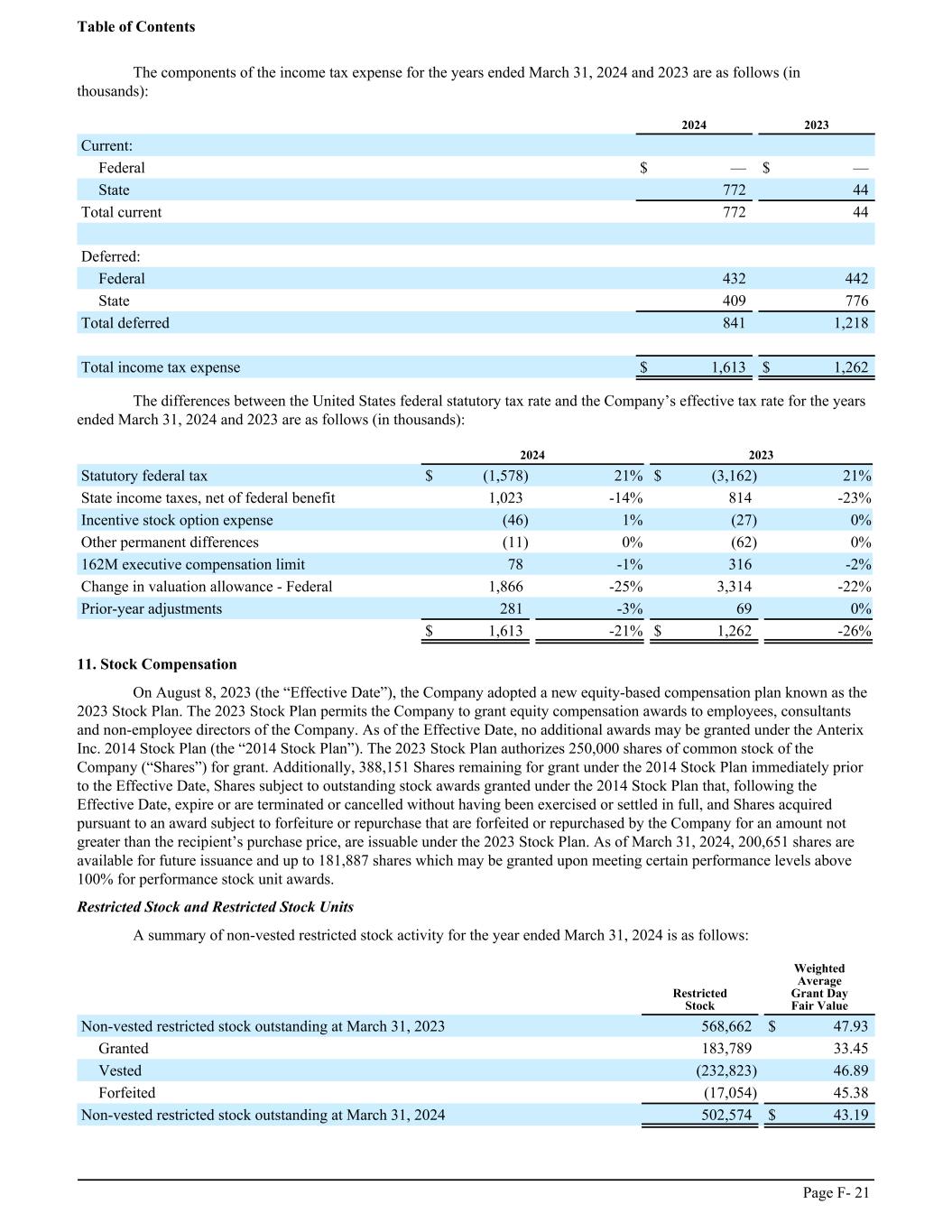 The components of the income tax expense for the years ended March 31, 2024 and 2023 are as follows (in thousands): ͏ 2024 2023 Current: Federal $ — $ — State 772 44 Total current 772 44 ͏ Deferred: Federal 432 442 State 409 776 Total deferred 841 1,218 ͏ Total income tax expense $ 1,613 $ 1,262 The differences between the United States federal statutory tax rate and the Company’s effective tax rate for the years ended March 31, 2024 and 2023 are as follows (in thousands): ͏ 2024 2023 Statutory federal tax $ (1,578) 21 % $ (3,162) 21 % State income taxes, net of federal benefit 1,023 -14 % 814 -23 % Incentive stock option expense (46) 1 % (27) 0 % Other permanent differences (11) 0 % (62) 0 % 162M executive compensation limit 78 -1 % 316 -2 % Change in valuation allowance - Federal 1,866 -25 % 3,314 -22 % Prior-year adjustments 281 -3 % 69 0 % ͏ $ 1,613 -21 % $ 1,262 -26 % 11. Stock Compensation On August 8, 2023 (the “Effective Date”), the Company adopted a new equity-based compensation plan known as the 2023 Stock Plan. The 2023 Stock Plan permits the Company to grant equity compensation awards to employees, consultants and non-employee directors of the Company. As of the Effective Date, no additional awards may be granted under the Anterix Inc. 2014 Stock Plan (the “2014 Stock Plan”). The 2023 Stock Plan authorizes 250,000 shares of common stock of the Company (“Shares”) for grant. Additionally, 388,151 Shares remaining for grant under the 2014 Stock Plan immediately prior to the Effective Date, Shares subject to outstanding stock awards granted under the 2014 Stock Plan that, following the Effective Date, expire or are terminated or cancelled without having been exercised or settled in full, and Shares acquired pursuant to an award subject to forfeiture or repurchase that are forfeited or repurchased by the Company for an amount not greater than the recipient’s purchase price, are issuable under the 2023 Stock Plan. As of March 31, 2024, 200,651 shares are available for future issuance and up to 181,887 shares which may be granted upon meeting certain performance levels above 100% for performance stock unit awards. Restricted Stock and Restricted Stock Units A summary of non-vested restricted stock activity for the year ended March 31, 2024 is as follows: ͏ Restricted Stock Weighted Average Grant Day Fair Value Non-vested restricted stock outstanding at March 31, 2023 568,662 $ 47.93 Granted 183,789 33.45 Vested (232,823) 46.89 Forfeited (17,054) 45.38 Non-vested restricted stock outstanding at March 31, 2024 502,574 $ 43.19 Table of Contents Page F- 21
