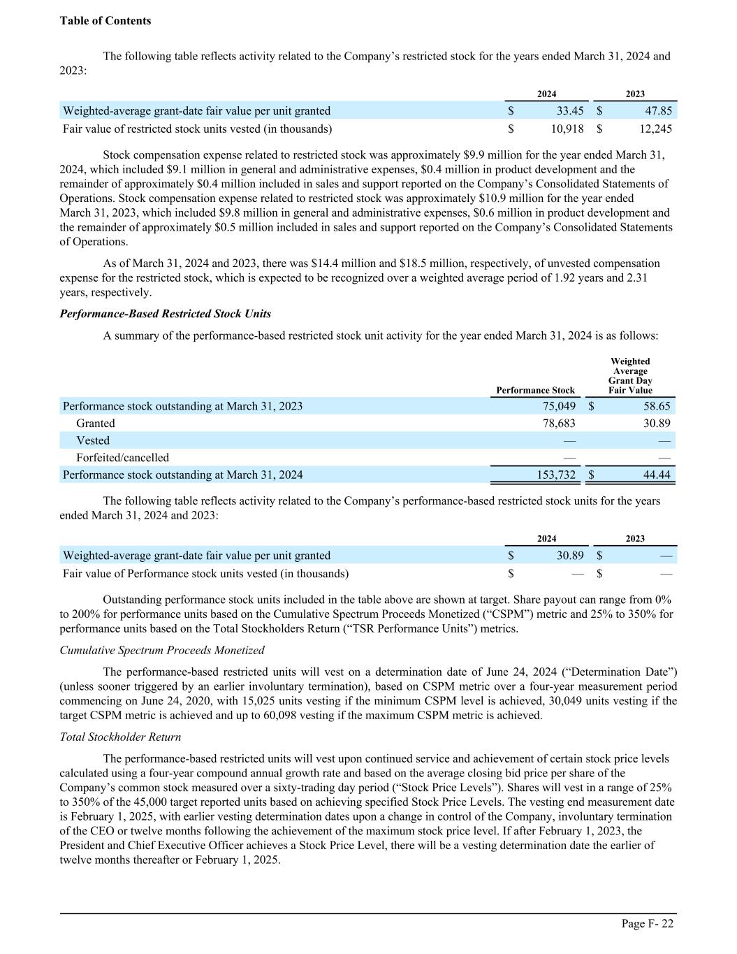 The following table reflects activity related to the Company’s restricted stock for the years ended March 31, 2024 and 2023: ͏ 2024 2023 Weighted-average grant-date fair value per unit granted $ 33.45 $ 47.85 Fair value of restricted stock units vested (in thousands) $ 10,918 $ 12,245 Stock compensation expense related to restricted stock was approximately $9.9 million for the year ended March 31, 2024, which included $9.1 million in general and administrative expenses, $0.4 million in product development and the remainder of approximately $0.4 million included in sales and support reported on the Company’s Consolidated Statements of Operations. Stock compensation expense related to restricted stock was approximately $10.9 million for the year ended March 31, 2023, which included $9.8 million in general and administrative expenses, $0.6 million in product development and the remainder of approximately $0.5 million included in sales and support reported on the Company’s Consolidated Statements of Operations. As of March 31, 2024 and 2023, there was $14.4 million and $18.5 million, respectively, of unvested compensation expense for the restricted stock, which is expected to be recognized over a weighted average period of 1.92 years and 2.31 years, respectively. Performance-Based Restricted Stock Units A summary of the performance-based restricted stock unit activity for the year ended March 31, 2024 is as follows: ͏ Performance Stock Weighted Average Grant Day Fair Value Performance stock outstanding at March 31, 2023 75,049 $ 58.65 Granted 78,683 30.89 Vested — — Forfeited/cancelled — — Performance stock outstanding at March 31, 2024 153,732 $ 44.44 The following table reflects activity related to the Company’s performance-based restricted stock units for the years ended March 31, 2024 and 2023: ͏ 2024 2023 Weighted-average grant-date fair value per unit granted $ 30.89 $ — Fair value of Performance stock units vested (in thousands) $ — $ — Outstanding performance stock units included in the table above are shown at target. Share payout can range from 0% to 200% for performance units based on the Cumulative Spectrum Proceeds Monetized (“CSPM”) metric and 25% to 350% for performance units based on the Total Stockholders Return (“TSR Performance Units”) metrics. Cumulative Spectrum Proceeds Monetized The performance-based restricted units will vest on a determination date of June 24, 2024 (“Determination Date”) (unless sooner triggered by an earlier involuntary termination), based on CSPM metric over a four-year measurement period commencing on June 24, 2020, with 15,025 units vesting if the minimum CSPM level is achieved, 30,049 units vesting if the target CSPM metric is achieved and up to 60,098 vesting if the maximum CSPM metric is achieved. Total Stockholder Return The performance-based restricted units will vest upon continued service and achievement of certain stock price levels calculated using a four-year compound annual growth rate and based on the average closing bid price per share of the Company’s common stock measured over a sixty-trading day period (“Stock Price Levels”). Shares will vest in a range of 25% to 350% of the 45,000 target reported units based on achieving specified Stock Price Levels. The vesting end measurement date is February 1, 2025, with earlier vesting determination dates upon a change in control of the Company, involuntary termination of the CEO or twelve months following the achievement of the maximum stock price level. If after February 1, 2023, the President and Chief Executive Officer achieves a Stock Price Level, there will be a vesting determination date the earlier of twelve months thereafter or February 1, 2025. Table of Contents Page F- 22