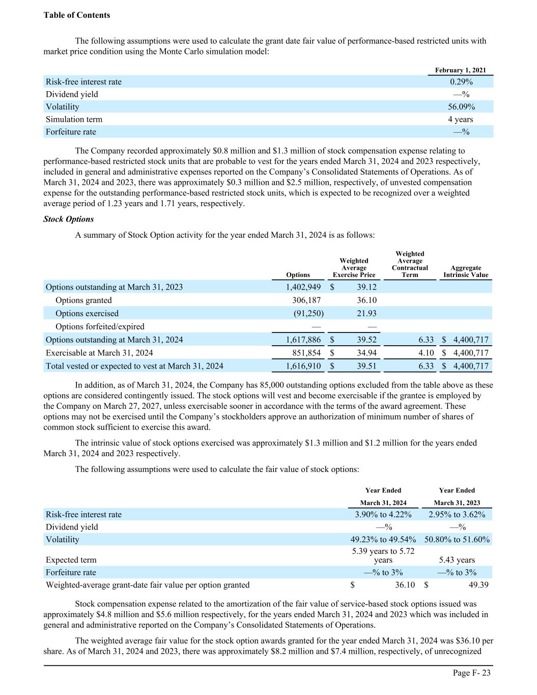 The following assumptions were used to calculate the grant date fair value of performance-based restricted units with market price condition using the Monte Carlo simulation model: ͏ February 1, 2021 Risk-free interest rate 0.29% Dividend yield —% Volatility 56.09% Simulation term 4 years Forfeiture rate —% The Company recorded approximately $0.8 million and $1.3 million of stock compensation expense relating to performance-based restricted stock units that are probable to vest for the years ended March 31, 2024 and 2023 respectively, included in general and administrative expenses reported on the Company’s Consolidated Statements of Operations. As of March 31, 2024 and 2023, there was approximately $0.3 million and $2.5 million, respectively, of unvested compensation expense for the outstanding performance-based restricted stock units, which is expected to be recognized over a weighted average period of 1.23 years and 1.71 years, respectively. Stock Options A summary of Stock Option activity for the year ended March 31, 2024 is as follows: ͏ Options Weighted Average Exercise Price Weighted Average Contractual Term Aggregate Intrinsic Value Options outstanding at March 31, 2023 1,402,949 $ 39.12 Options granted 306,187 36.10 Options exercised (91,250) 21.93 Options forfeited/expired — — Options outstanding at March 31, 2024 1,617,886 $ 39.52 6.33 $ 4,400,717 Exercisable at March 31, 2024 851,854 $ 34.94 4.10 $ 4,400,717 Total vested or expected to vest at March 31, 2024 1,616,910 $ 39.51 6.33 $ 4,400,717 In addition, as of March 31, 2024, the Company has 85,000 outstanding options excluded from the table above as these options are considered contingently issued. The stock options will vest and become exercisable if the grantee is employed by the Company on March 27, 2027, unless exercisable sooner in accordance with the terms of the award agreement. These options may not be exercised until the Company’s stockholders approve an authorization of minimum number of shares of common stock sufficient to exercise this award. The intrinsic value of stock options exercised was approximately $1.3 million and $1.2 million for the years ended March 31, 2024 and 2023 respectively. The following assumptions were used to calculate the fair value of stock options: ͏ Year Ended Year Ended ͏ March 31, 2024 March 31, 2023 Risk-free interest rate 3.90% to 4.22% 2.95% to 3.62% Dividend yield —% —% Volatility 49.23% to 49.54% 50.80% to 51.60% Expected term 5.39 years to 5.72 years 5.43 years Forfeiture rate —% to 3% —% to 3% Weighted-average grant-date fair value per option granted $ 36.10 $ 49.39 Stock compensation expense related to the amortization of the fair value of service-based stock options issued was approximately $4.8 million and $5.6 million respectively, for the years ended March 31, 2024 and 2023 which was included in general and administrative reported on the Company’s Consolidated Statements of Operations. The weighted average fair value for the stock option awards granted for the year ended March 31, 2024 was $36.10 per share. As of March 31, 2024 and 2023, there was approximately $8.2 million and $7.4 million, respectively, of unrecognized Table of Contents Page F- 23
