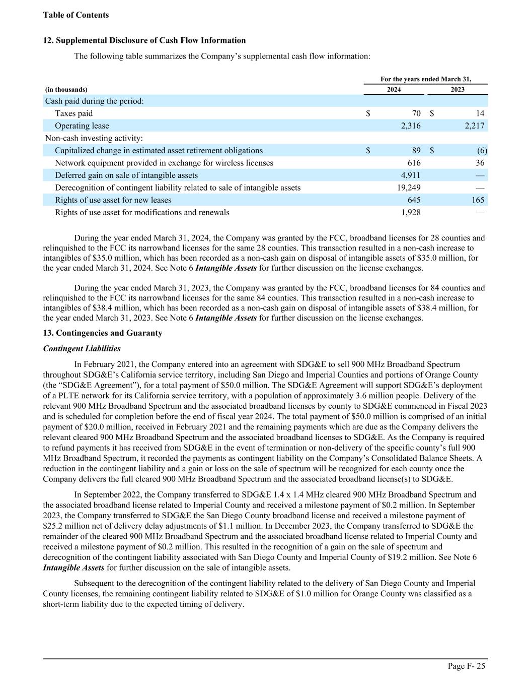 12. Supplemental Disclosure of Cash Flow Information The following table summarizes the Company’s supplemental cash flow information: ͏ For the years ended March 31, (in thousands) 2024 2023 Cash paid during the period: Taxes paid $ 70 $ 14 Operating lease 2,316 2,217 Non-cash investing activity: Capitalized change in estimated asset retirement obligations $ 89 $ (6) Network equipment provided in exchange for wireless licenses 616 36 Deferred gain on sale of intangible assets 4,911 — Derecognition of contingent liability related to sale of intangible assets 19,249 — Rights of use asset for new leases 645 165 Rights of use asset for modifications and renewals 1,928 — During the year ended March 31, 2024, the Company was granted by the FCC, broadband licenses for 28 counties and relinquished to the FCC its narrowband licenses for the same 28 counties. This transaction resulted in a non-cash increase to intangibles of $35.0 million, which has been recorded as a non-cash gain on disposal of intangible assets of $35.0 million, for the year ended March 31, 2024. See Note 6 Intangible Assets for further discussion on the license exchanges. During the year ended March 31, 2023, the Company was granted by the FCC, broadband licenses for 84 counties and relinquished to the FCC its narrowband licenses for the same 84 counties. This transaction resulted in a non-cash increase to intangibles of $38.4 million, which has been recorded as a non-cash gain on disposal of intangible assets of $38.4 million, for the year ended March 31, 2023. See Note 6 Intangible Assets for further discussion on the license exchanges. 13. Contingencies and Guaranty Contingent Liabilities In February 2021, the Company entered into an agreement with SDG&E to sell 900 MHz Broadband Spectrum throughout SDG&E’s California service territory, including San Diego and Imperial Counties and portions of Orange County (the “SDG&E Agreement”), for a total payment of $50.0 million. The SDG&E Agreement will support SDG&E’s deployment of a PLTE network for its California service territory, with a population of approximately 3.6 million people. Delivery of the relevant 900 MHz Broadband Spectrum and the associated broadband licenses by county to SDG&E commenced in Fiscal 2023 and is scheduled for completion before the end of fiscal year 2024. The total payment of $50.0 million is comprised of an initial payment of $20.0 million, received in February 2021 and the remaining payments which are due as the Company delivers the relevant cleared 900 MHz Broadband Spectrum and the associated broadband licenses to SDG&E. As the Company is required to refund payments it has received from SDG&E in the event of termination or non-delivery of the specific county’s full 900 MHz Broadband Spectrum, it recorded the payments as contingent liability on the Company’s Consolidated Balance Sheets. A reduction in the contingent liability and a gain or loss on the sale of spectrum will be recognized for each county once the Company delivers the full cleared 900 MHz Broadband Spectrum and the associated broadband license(s) to SDG&E. In September 2022, the Company transferred to SDG&E 1.4 x 1.4 MHz cleared 900 MHz Broadband Spectrum and the associated broadband license related to Imperial County and received a milestone payment of $0.2 million. In September 2023, the Company transferred to SDG&E the San Diego County broadband license and received a milestone payment of $25.2 million net of delivery delay adjustments of $1.1 million. In December 2023, the Company transferred to SDG&E the remainder of the cleared 900 MHz Broadband Spectrum and the associated broadband license related to Imperial County and received a milestone payment of $0.2 million. This resulted in the recognition of a gain on the sale of spectrum and derecognition of the contingent liability associated with San Diego County and Imperial County of $19.2 million. See Note 6 Intangible Assets for further discussion on the sale of intangible assets. Subsequent to the derecognition of the contingent liability related to the delivery of San Diego County and Imperial County licenses, the remaining contingent liability related to SDG&E of $1.0 million for Orange County was classified as a short-term liability due to the expected timing of delivery. Table of Contents Page F- 25