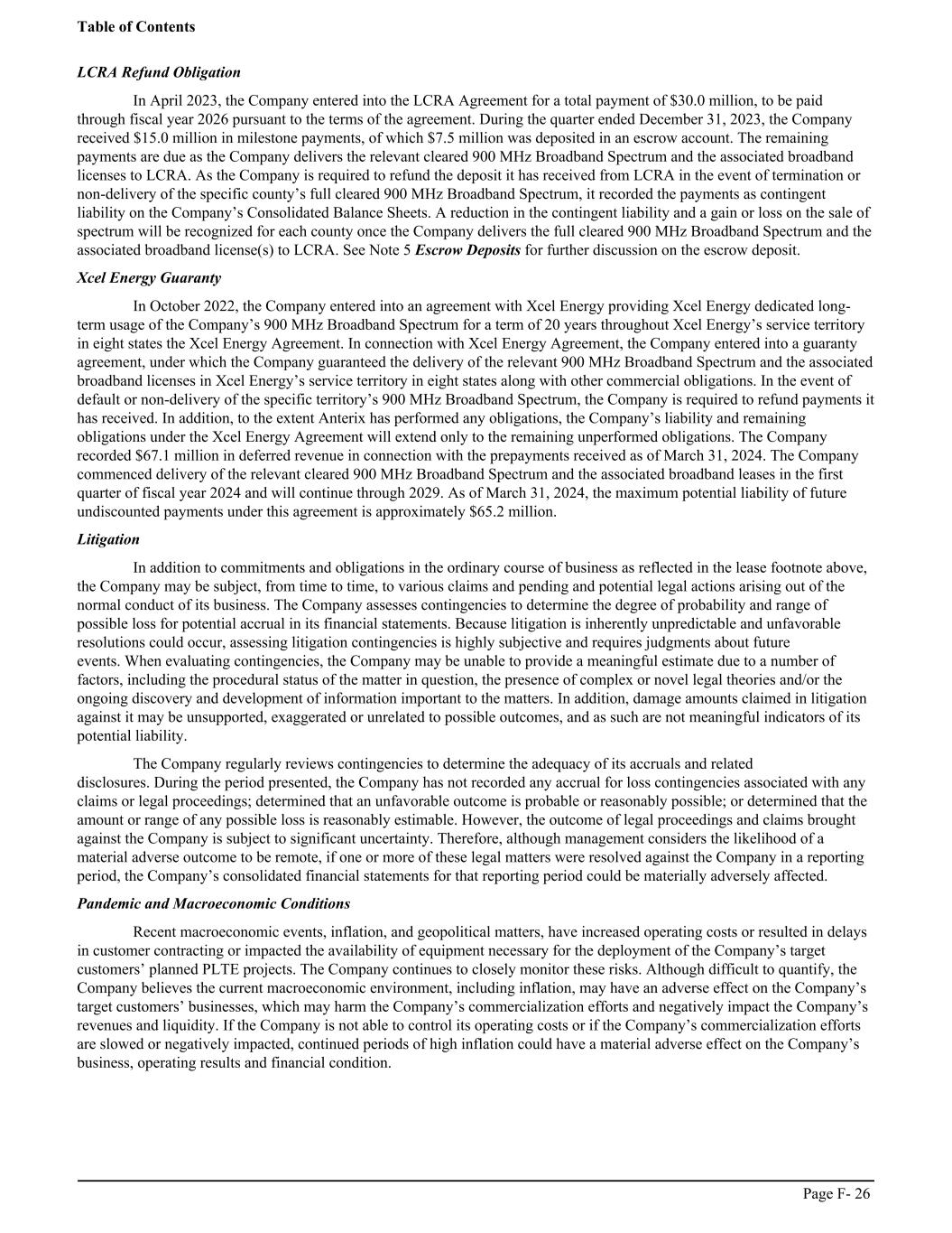 LCRA Refund Obligation In April 2023, the Company entered into the LCRA Agreement for a total payment of $30.0 million, to be paid through fiscal year 2026 pursuant to the terms of the agreement. During the quarter ended December 31, 2023, the Company received $15.0 million in milestone payments, of which $7.5 million was deposited in an escrow account. The remaining payments are due as the Company delivers the relevant cleared 900 MHz Broadband Spectrum and the associated broadband licenses to LCRA. As the Company is required to refund the deposit it has received from LCRA in the event of termination or non-delivery of the specific county’s full cleared 900 MHz Broadband Spectrum, it recorded the payments as contingent liability on the Company’s Consolidated Balance Sheets. A reduction in the contingent liability and a gain or loss on the sale of spectrum will be recognized for each county once the Company delivers the full cleared 900 MHz Broadband Spectrum and the associated broadband license(s) to LCRA. See Note 5 Escrow Deposits for further discussion on the escrow deposit. Xcel Energy Guaranty In October 2022, the Company entered into an agreement with Xcel Energy providing Xcel Energy dedicated long- term usage of the Company’s 900 MHz Broadband Spectrum for a term of 20 years throughout Xcel Energy’s service territory in eight states the Xcel Energy Agreement. In connection with Xcel Energy Agreement, the Company entered into a guaranty agreement, under which the Company guaranteed the delivery of the relevant 900 MHz Broadband Spectrum and the associated broadband licenses in Xcel Energy’s service territory in eight states along with other commercial obligations. In the event of default or non-delivery of the specific territory’s 900 MHz Broadband Spectrum, the Company is required to refund payments it has received. In addition, to the extent Anterix has performed any obligations, the Company’s liability and remaining obligations under the Xcel Energy Agreement will extend only to the remaining unperformed obligations. The Company recorded $67.1 million in deferred revenue in connection with the prepayments received as of March 31, 2024. The Company commenced delivery of the relevant cleared 900 MHz Broadband Spectrum and the associated broadband leases in the first quarter of fiscal year 2024 and will continue through 2029. As of March 31, 2024, the maximum potential liability of future undiscounted payments under this agreement is approximately $65.2 million. Litigation In addition to commitments and obligations in the ordinary course of business as reflected in the lease footnote above, the Company may be subject, from time to time, to various claims and pending and potential legal actions arising out of the normal conduct of its business. The Company assesses contingencies to determine the degree of probability and range of possible loss for potential accrual in its financial statements. Because litigation is inherently unpredictable and unfavorable resolutions could occur, assessing litigation contingencies is highly subjective and requires judgments about future events. When evaluating contingencies, the Company may be unable to provide a meaningful estimate due to a number of factors, including the procedural status of the matter in question, the presence of complex or novel legal theories and/or the ongoing discovery and development of information important to the matters. In addition, damage amounts claimed in litigation against it may be unsupported, exaggerated or unrelated to possible outcomes, and as such are not meaningful indicators of its potential liability. The Company regularly reviews contingencies to determine the adequacy of its accruals and related disclosures. During the period presented, the Company has not recorded any accrual for loss contingencies associated with any claims or legal proceedings; determined that an unfavorable outcome is probable or reasonably possible; or determined that the amount or range of any possible loss is reasonably estimable. However, the outcome of legal proceedings and claims brought against the Company is subject to significant uncertainty. Therefore, although management considers the likelihood of a material adverse outcome to be remote, if one or more of these legal matters were resolved against the Company in a reporting period, the Company’s consolidated financial statements for that reporting period could be materially adversely affected. Pandemic and Macroeconomic Conditions Recent macroeconomic events, inflation, and geopolitical matters, have increased operating costs or resulted in delays in customer contracting or impacted the availability of equipment necessary for the deployment of the Company’s target customers’ planned PLTE projects. The Company continues to closely monitor these risks. Although difficult to quantify, the Company believes the current macroeconomic environment, including inflation, may have an adverse effect on the Company’s target customers’ businesses, which may harm the Company’s commercialization efforts and negatively impact the Company’s revenues and liquidity. If the Company is not able to control its operating costs or if the Company’s commercialization efforts are slowed or negatively impacted, continued periods of high inflation could have a material adverse effect on the Company’s business, operating results and financial condition. Table of Contents Page F- 26