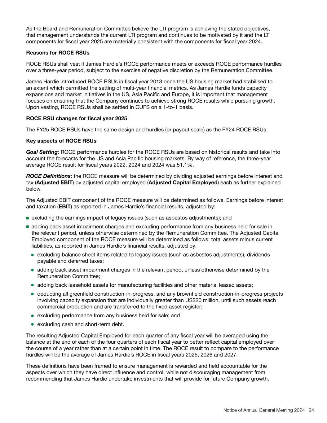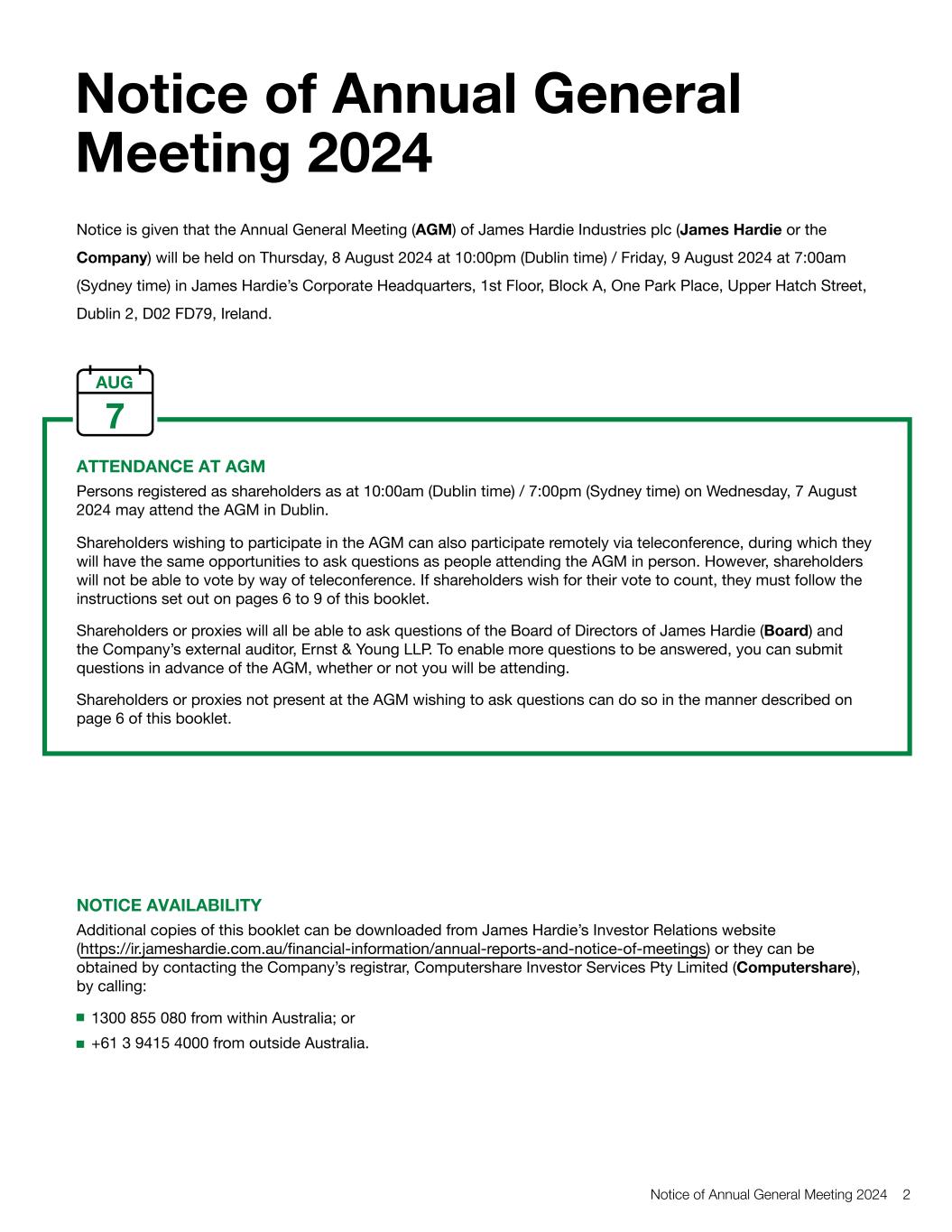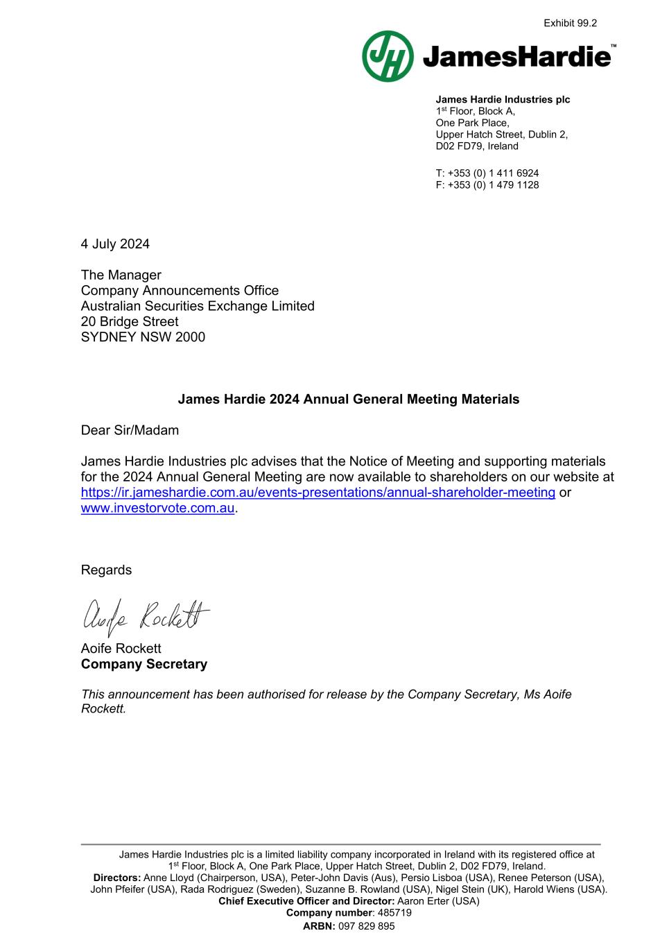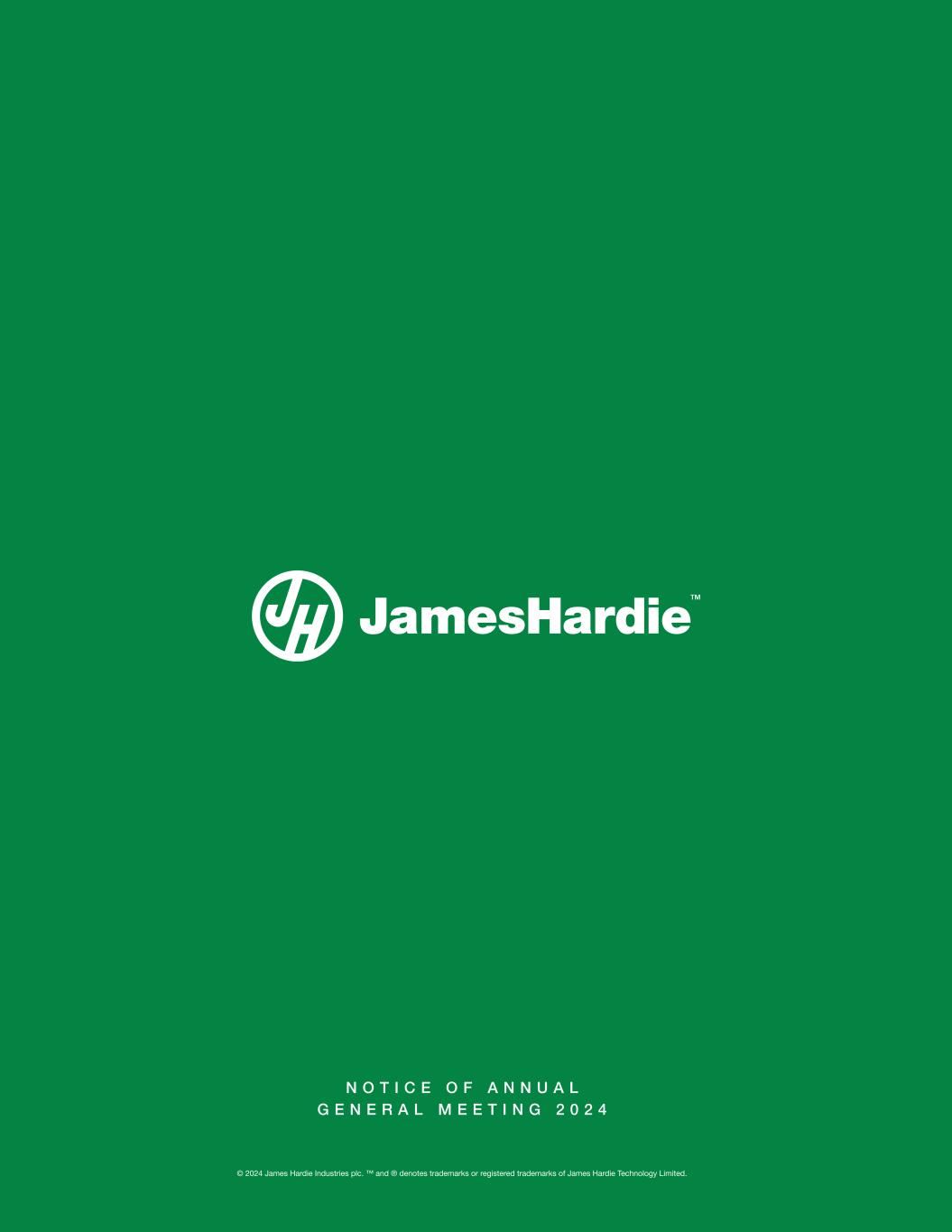 Forward-looking statements are based on the Company’s current expectations, estimates and assumptions and because forward-looking statements address future results, events and conditions, they, by their very nature, involve inherent risks and uncertainties, many of which are unforeseeable and beyond the Company’s control. Such known and unknown risks, uncertainties and other factors may cause actual results, performance or other achievements to differ materially from the anticipated results, performance or achievements expressed, projected or implied by these forward-looking statements. These factors, some of which are discussed under “Risk Factors” in Section 3 of the Form 20-F filed with the Securities and Exchange Commission on 20 May 2024, include, but are not limited to: all matters relating to or arising out of the prior manufacture of products that contained asbestos by current and former Company subsidiaries; required contributions to AICF, any shortfall in AICF funding and the effect of currency exchange rate movements on the amount recorded in the Company’s financial statements as an asbestos liability; compliance with and changes in tax laws and treatments; competition and product pricing in the markets in which the Company operates; the consequences of product failures or defects; exposure to environmental, asbestos, putative consumer class action or other legal proceedings; general economic and market conditions; the supply and cost of raw materials; possible increases in competition and the potential that competitors could copy the Company’s products; compliance with and changes in environmental and health and safety laws; risks of conducting business internationally; compliance with and changes in laws and regulations; currency exchange risks; dependence on customer preference and the concentration of the Company’s customer base; dependence on residential and commercial construction markets; the effect of adverse changes in climate or weather patterns; use of accounting estimates; and all other risks identified in the Company’s reports filed with Australian, Irish and US securities regulatory agencies and exchanges (as appropriate). The Company cautions you that the foregoing list of factors is not exhaustive and that other risks and uncertainties may cause actual results to differ materially from those referenced in the Company’s forward-looking statements. Forward-looking statements speak only as of the date they are made and are statements of the Company’s current expectations concerning future results, events and conditions. The Company assumes no obligation to update any forward-looking statements or information except as required by law.
