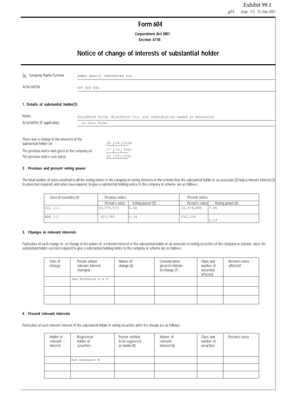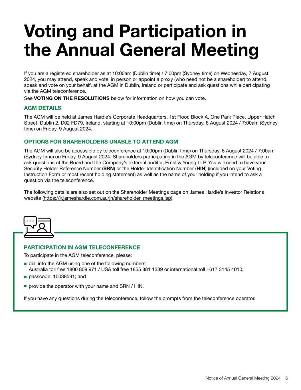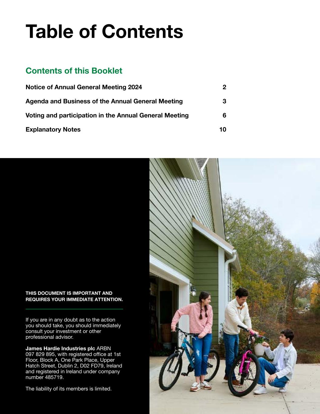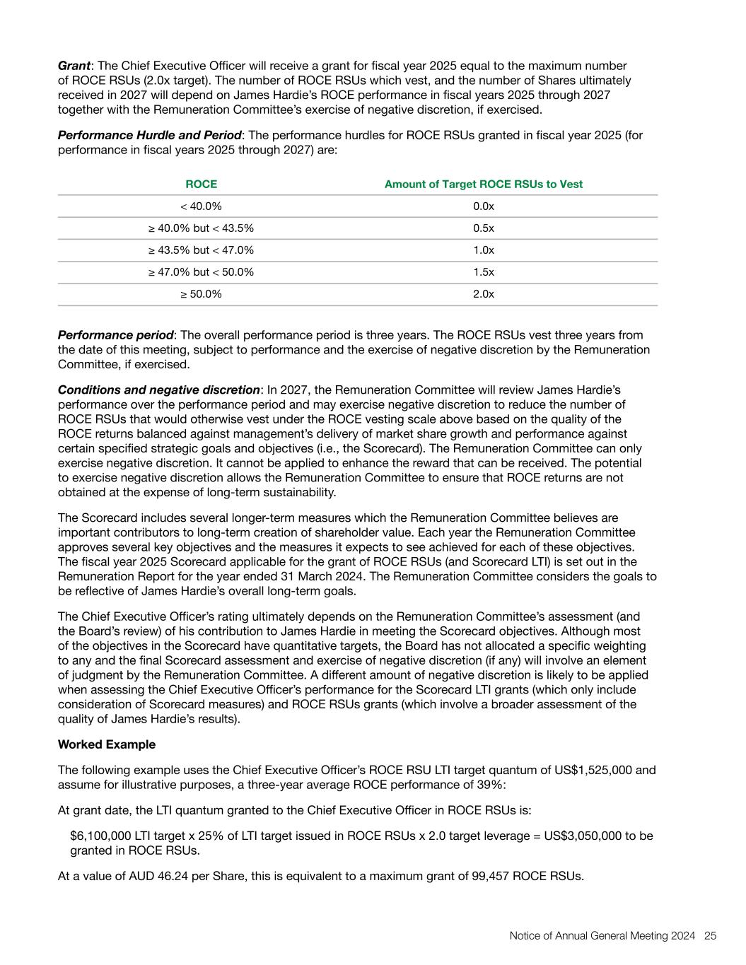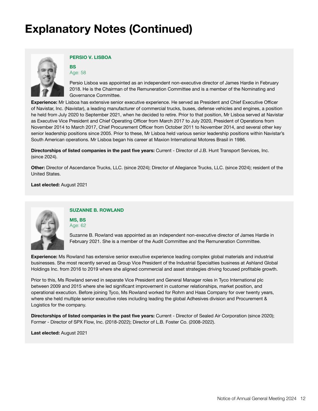 Forward-looking statements are based on the Company’s current expectations, estimates and assumptions and because forward-looking statements address future results, events and conditions, they, by their very nature, involve inherent risks and uncertainties, many of which are unforeseeable and beyond the Company’s control. Such known and unknown risks, uncertainties and other factors may cause actual results, performance or other achievements to differ materially from the anticipated results, performance or achievements expressed, projected or implied by these forward-looking statements. These factors, some of which are discussed under “Risk Factors” in Section 3 of the Form 20-F filed with the Securities and Exchange Commission on 20 May 2024, include, but are not limited to: all matters relating to or arising out of the prior manufacture of products that contained asbestos by current and former Company subsidiaries; required contributions to AICF, any shortfall in AICF funding and the effect of currency exchange rate movements on the amount recorded in the Company’s financial statements as an asbestos liability; compliance with and changes in tax laws and treatments; competition and product pricing in the markets in which the Company operates; the consequences of product failures or defects; exposure to environmental, asbestos, putative consumer class action or other legal proceedings; general economic and market conditions; the supply and cost of raw materials; possible increases in competition and the potential that competitors could copy the Company’s products; compliance with and changes in environmental and health and safety laws; risks of conducting business internationally; compliance with and changes in laws and regulations; currency exchange risks; dependence on customer preference and the concentration of the Company’s customer base; dependence on residential and commercial construction markets; the effect of adverse changes in climate or weather patterns; use of accounting estimates; and all other risks identified in the Company’s reports filed with Australian, Irish and US securities regulatory agencies and exchanges (as appropriate). The Company cautions you that the foregoing list of factors is not exhaustive and that other risks and uncertainties may cause actual results to differ materially from those referenced in the Company’s forward-looking statements. Forward-looking statements speak only as of the date they are made and are statements of the Company’s current expectations concerning future results, events and conditions. The Company assumes no obligation to update any forward-looking statements or information except as required by law.
