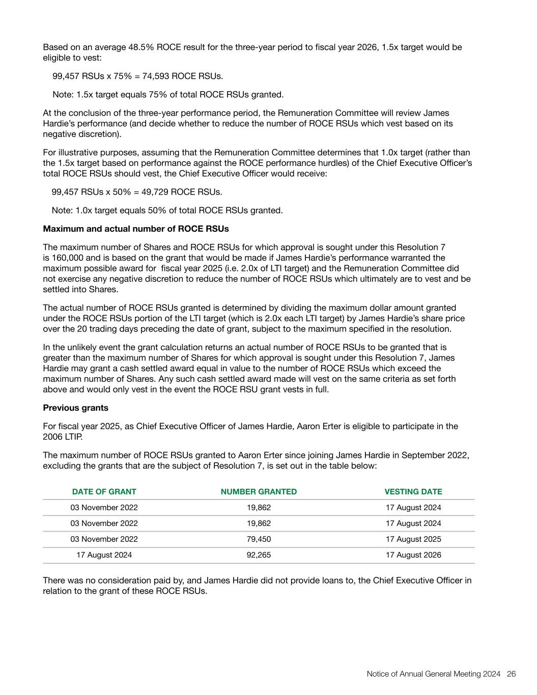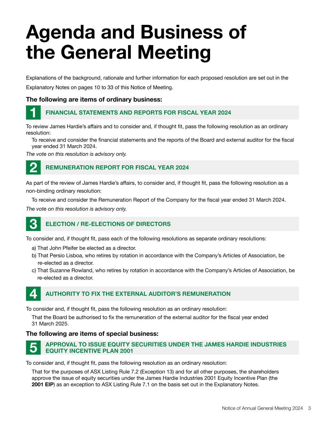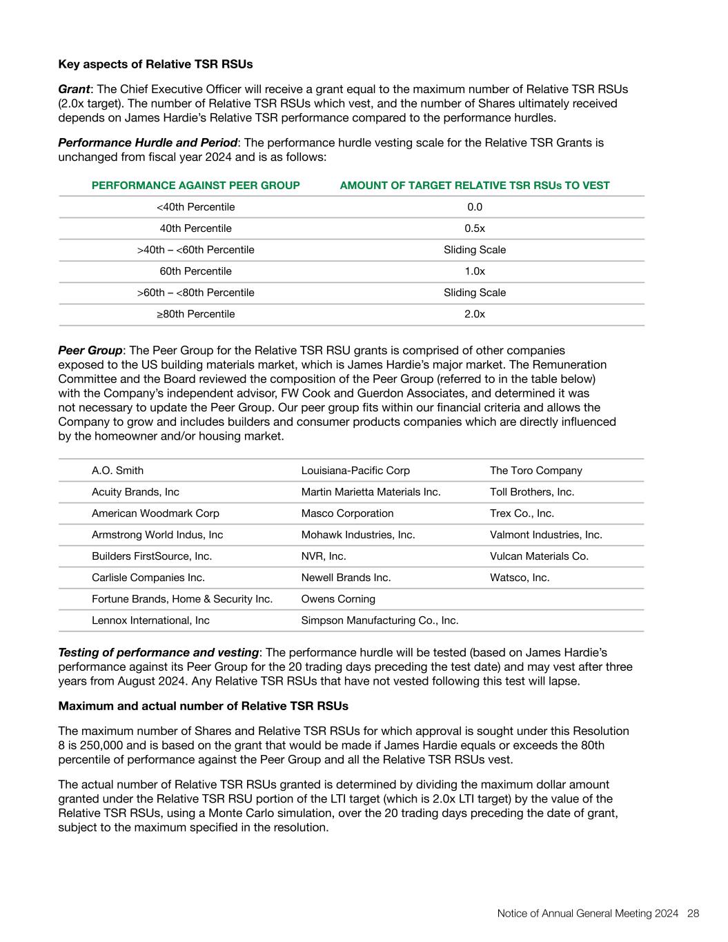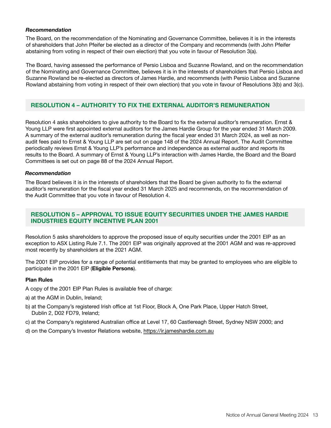 Forward-looking statements are based on the Company’s current expectations, estimates and assumptions and because forward-looking statements address future results, events and conditions, they, by their very nature, involve inherent risks and uncertainties, many of which are unforeseeable and beyond the Company’s control. Such known and unknown risks, uncertainties and other factors may cause actual results, performance or other achievements to differ materially from the anticipated results, performance or achievements expressed, projected or implied by these forward-looking statements. These factors, some of which are discussed under “Risk Factors” in Section 3 of the Form 20-F filed with the Securities and Exchange Commission on 20 May 2024, include, but are not limited to: all matters relating to or arising out of the prior manufacture of products that contained asbestos by current and former Company subsidiaries; required contributions to AICF, any shortfall in AICF funding and the effect of currency exchange rate movements on the amount recorded in the Company’s financial statements as an asbestos liability; compliance with and changes in tax laws and treatments; competition and product pricing in the markets in which the Company operates; the consequences of product failures or defects; exposure to environmental, asbestos, putative consumer class action or other legal proceedings; general economic and market conditions; the supply and cost of raw materials; possible increases in competition and the potential that competitors could copy the Company’s products; compliance with and changes in environmental and health and safety laws; risks of conducting business internationally; compliance with and changes in laws and regulations; currency exchange risks; dependence on customer preference and the concentration of the Company’s customer base; dependence on residential and commercial construction markets; the effect of adverse changes in climate or weather patterns; use of accounting estimates; and all other risks identified in the Company’s reports filed with Australian, Irish and US securities regulatory agencies and exchanges (as appropriate). The Company cautions you that the foregoing list of factors is not exhaustive and that other risks and uncertainties may cause actual results to differ materially from those referenced in the Company’s forward-looking statements. Forward-looking statements speak only as of the date they are made and are statements of the Company’s current expectations concerning future results, events and conditions. The Company assumes no obligation to update any forward-looking statements or information except as required by law.