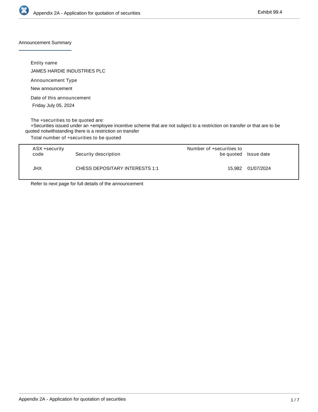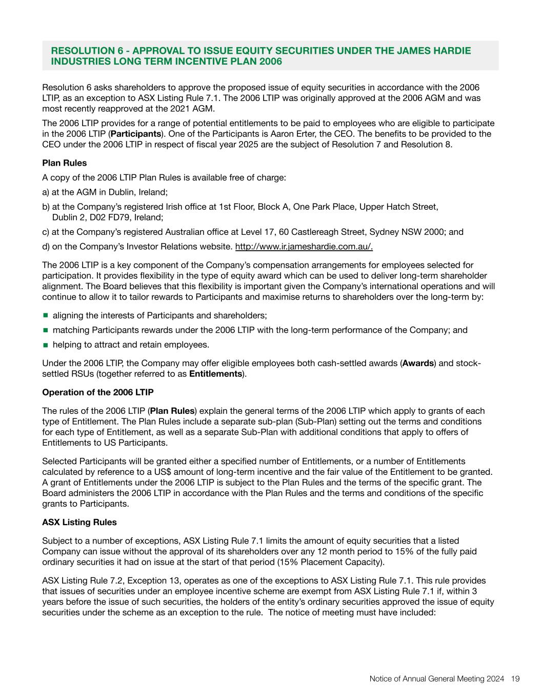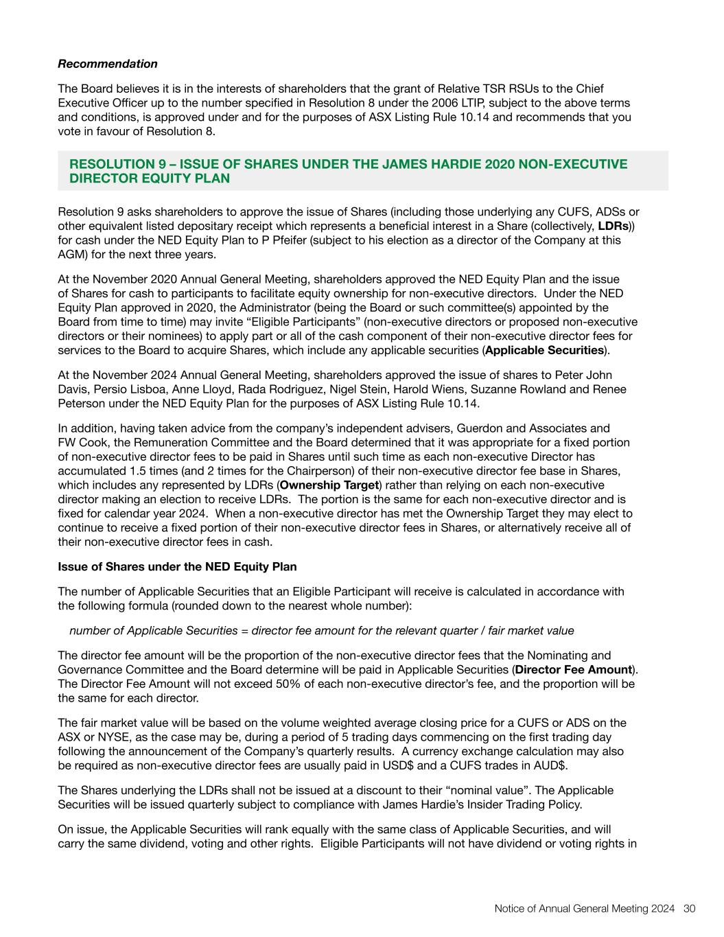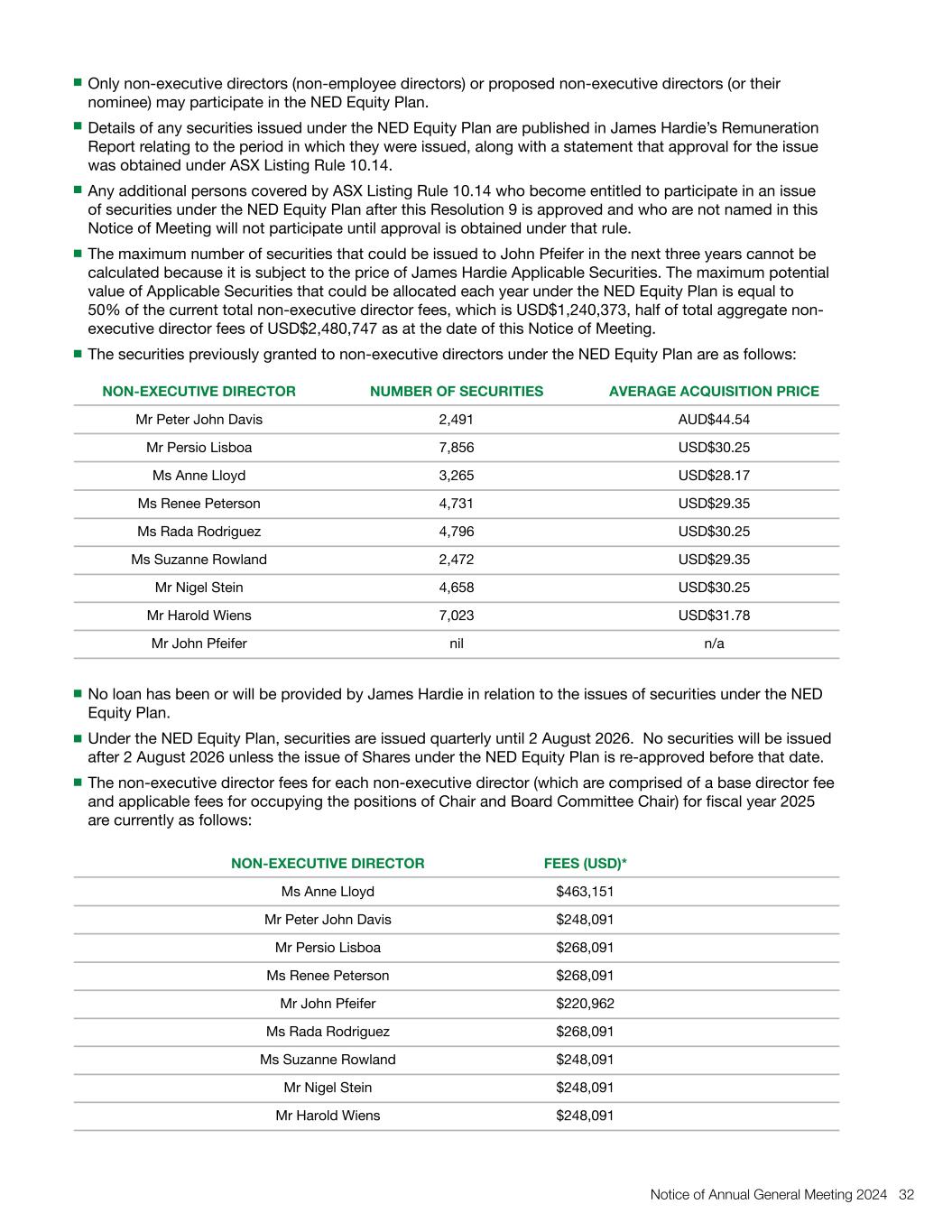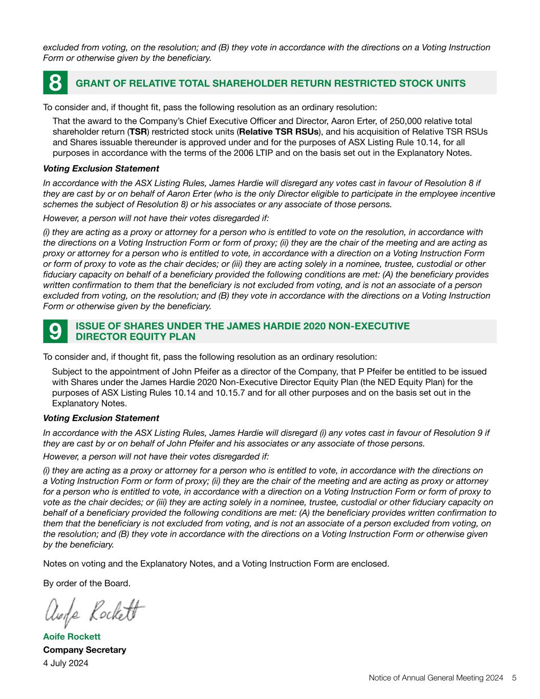 Forward-looking statements are based on the Company’s current expectations, estimates and assumptions and because forward-looking statements address future results, events and conditions, they, by their very nature, involve inherent risks and uncertainties, many of which are unforeseeable and beyond the Company’s control. Such known and unknown risks, uncertainties and other factors may cause actual results, performance or other achievements to differ materially from the anticipated results, performance or achievements expressed, projected or implied by these forward-looking statements. These factors, some of which are discussed under “Risk Factors” in Section 3 of the Form 20-F filed with the Securities and Exchange Commission on 20 May 2024, include, but are not limited to: all matters relating to or arising out of the prior manufacture of products that contained asbestos by current and former Company subsidiaries; required contributions to AICF, any shortfall in AICF funding and the effect of currency exchange rate movements on the amount recorded in the Company’s financial statements as an asbestos liability; compliance with and changes in tax laws and treatments; competition and product pricing in the markets in which the Company operates; the consequences of product failures or defects; exposure to environmental, asbestos, putative consumer class action or other legal proceedings; general economic and market conditions; the supply and cost of raw materials; possible increases in competition and the potential that competitors could copy the Company’s products; compliance with and changes in environmental and health and safety laws; risks of conducting business internationally; compliance with and changes in laws and regulations; currency exchange risks; dependence on customer preference and the concentration of the Company’s customer base; dependence on residential and commercial construction markets; the effect of adverse changes in climate or weather patterns; use of accounting estimates; and all other risks identified in the Company’s reports filed with Australian, Irish and US securities regulatory agencies and exchanges (as appropriate). The Company cautions you that the foregoing list of factors is not exhaustive and that other risks and uncertainties may cause actual results to differ materially from those referenced in the Company’s forward-looking statements. Forward-looking statements speak only as of the date they are made and are statements of the Company’s current expectations concerning future results, events and conditions. The Company assumes no obligation to update any forward-looking statements or information except as required by law.