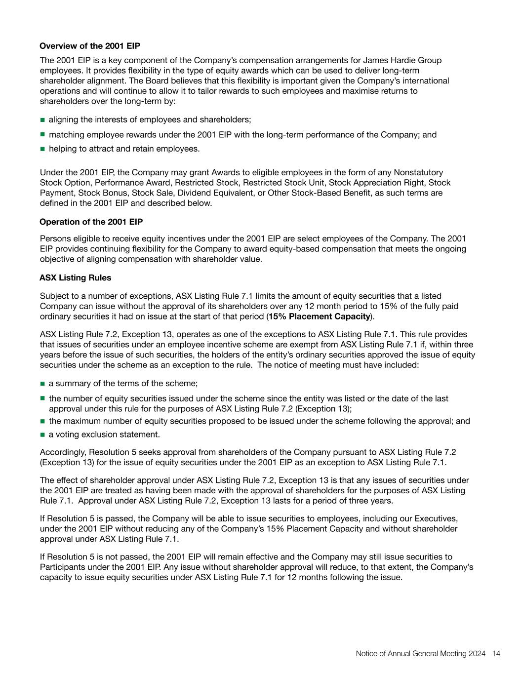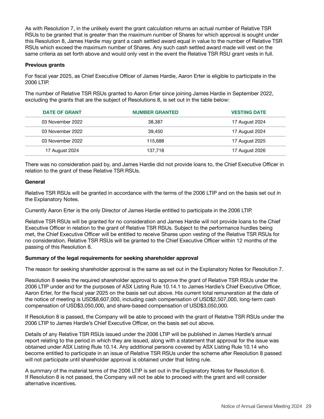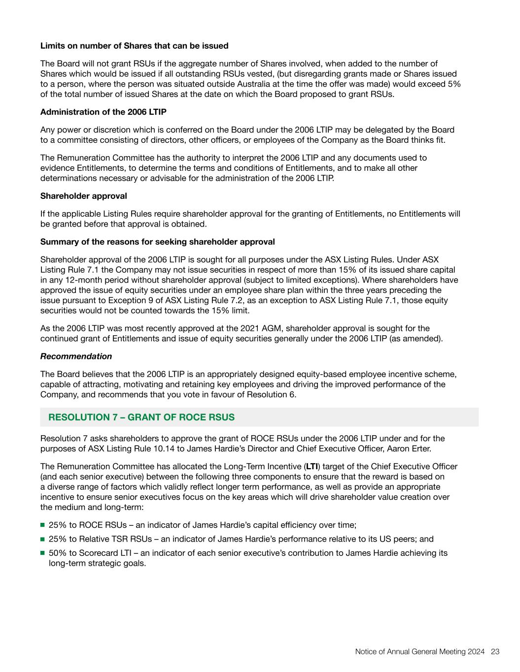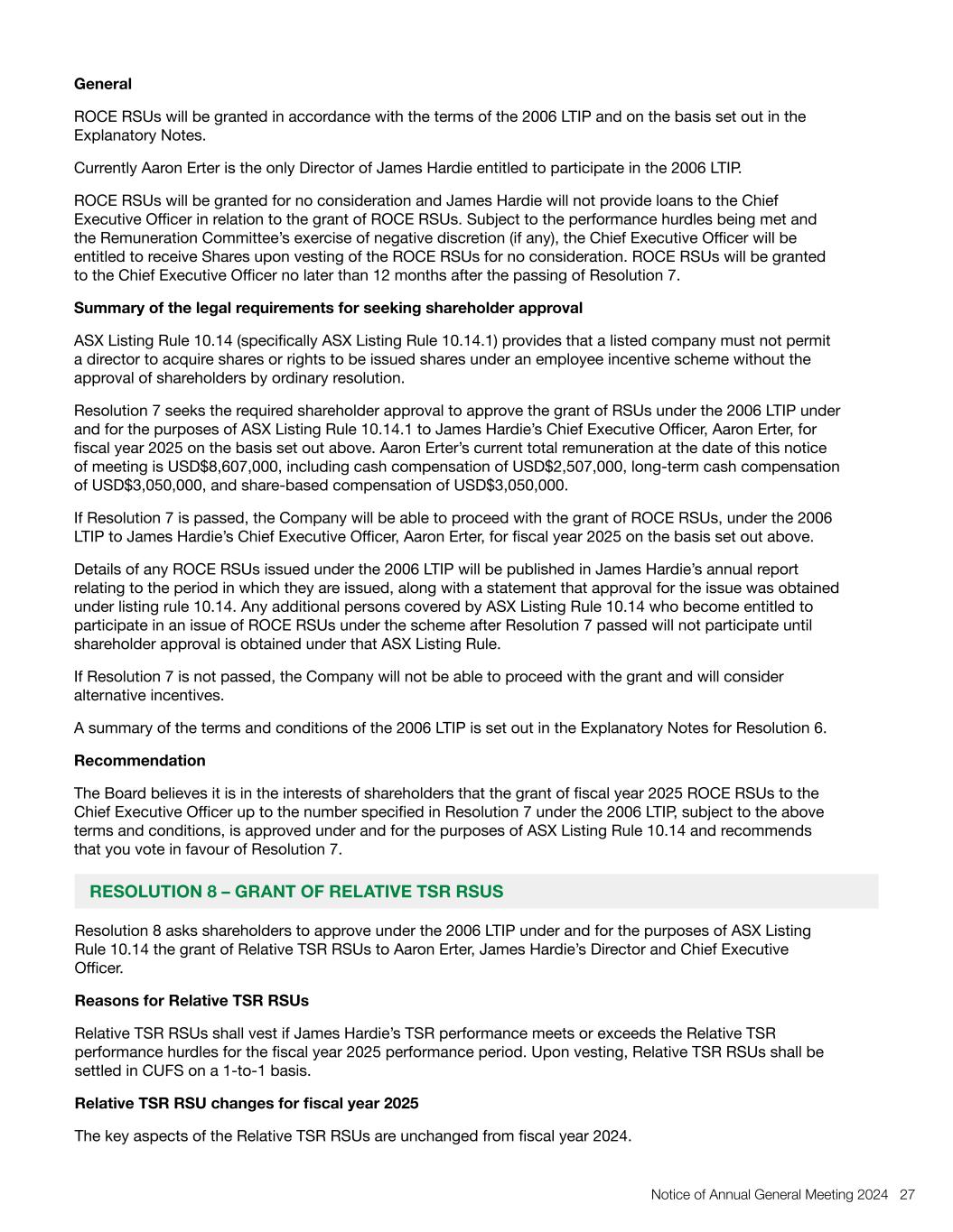 Forward-looking statements are based on the Company’s current expectations, estimates and assumptions and because forward-looking statements address future results, events and conditions, they, by their very nature, involve inherent risks and uncertainties, many of which are unforeseeable and beyond the Company’s control. Such known and unknown risks, uncertainties and other factors may cause actual results, performance or other achievements to differ materially from the anticipated results, performance or achievements expressed, projected or implied by these forward-looking statements. These factors, some of which are discussed under “Risk Factors” in Section 3 of the Form 20-F filed with the Securities and Exchange Commission on 20 May 2024, include, but are not limited to: all matters relating to or arising out of the prior manufacture of products that contained asbestos by current and former Company subsidiaries; required contributions to AICF, any shortfall in AICF funding and the effect of currency exchange rate movements on the amount recorded in the Company’s financial statements as an asbestos liability; compliance with and changes in tax laws and treatments; competition and product pricing in the markets in which the Company operates; the consequences of product failures or defects; exposure to environmental, asbestos, putative consumer class action or other legal proceedings; general economic and market conditions; the supply and cost of raw materials; possible increases in competition and the potential that competitors could copy the Company’s products; compliance with and changes in environmental and health and safety laws; risks of conducting business internationally; compliance with and changes in laws and regulations; currency exchange risks; dependence on customer preference and the concentration of the Company’s customer base; dependence on residential and commercial construction markets; the effect of adverse changes in climate or weather patterns; use of accounting estimates; and all other risks identified in the Company’s reports filed with Australian, Irish and US securities regulatory agencies and exchanges (as appropriate). The Company cautions you that the foregoing list of factors is not exhaustive and that other risks and uncertainties may cause actual results to differ materially from those referenced in the Company’s forward-looking statements. Forward-looking statements speak only as of the date they are made and are statements of the Company’s current expectations concerning future results, events and conditions. The Company assumes no obligation to update any forward-looking statements or information except as required by law.