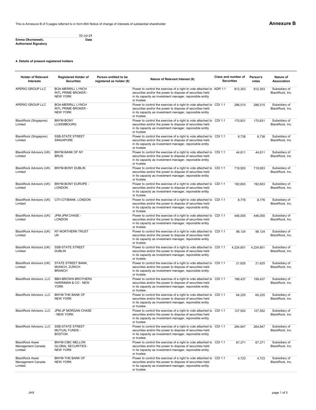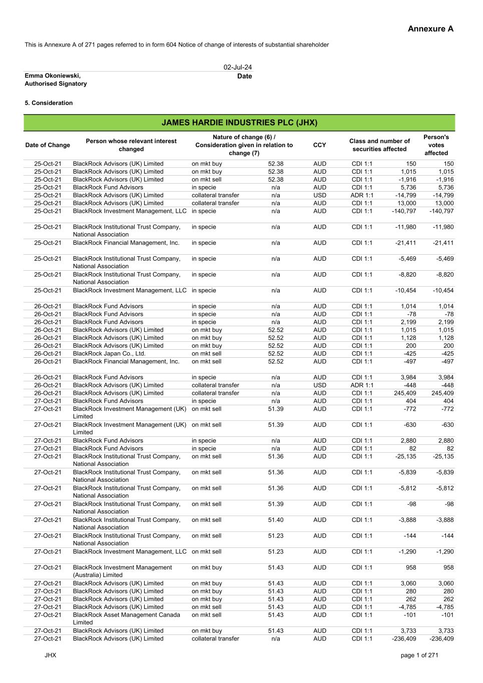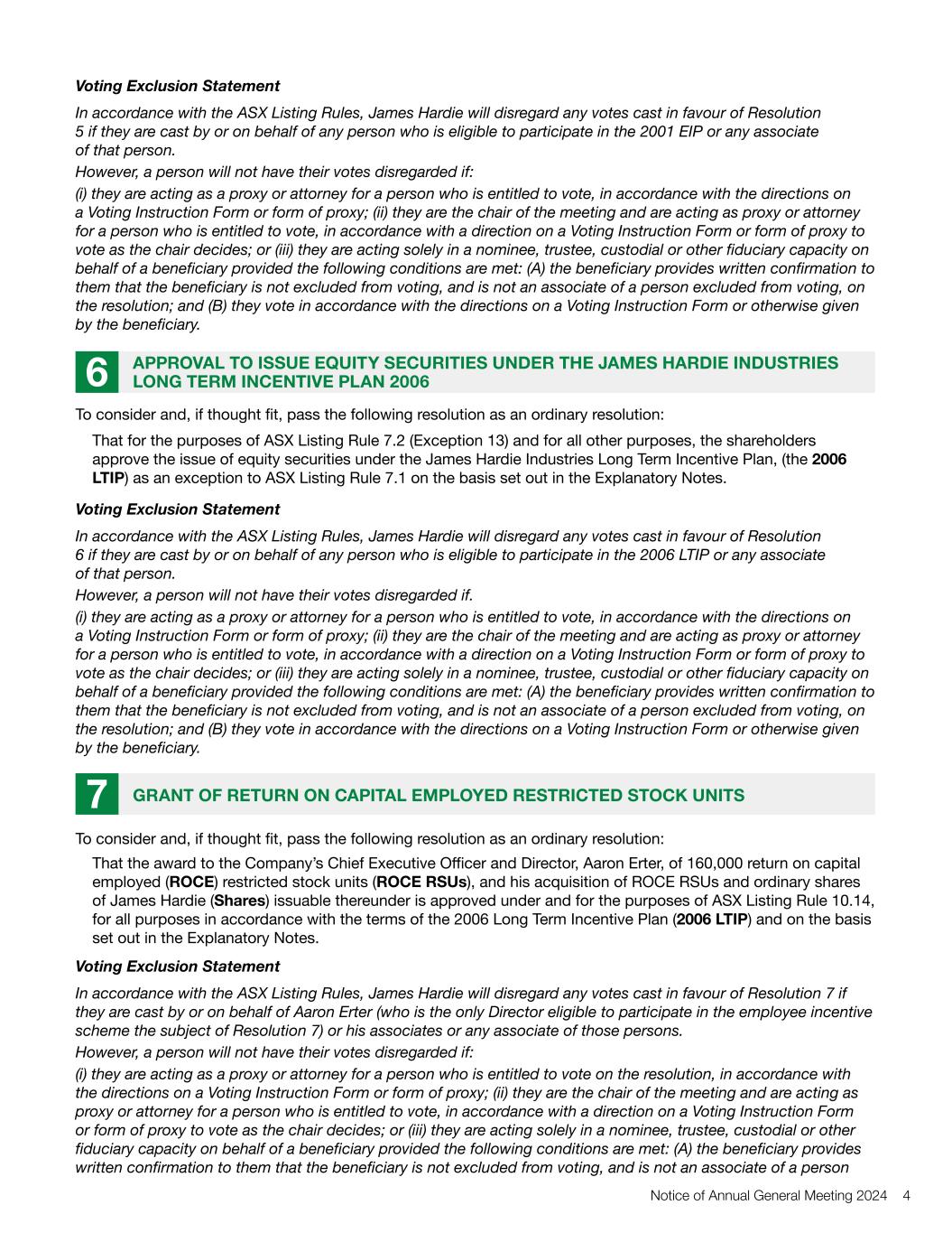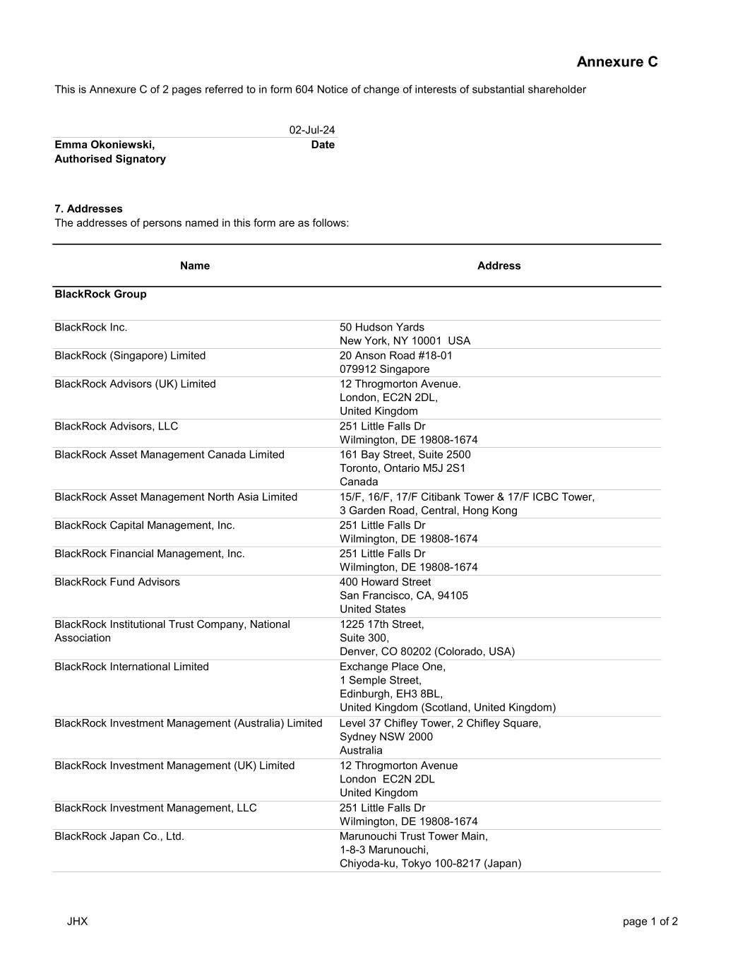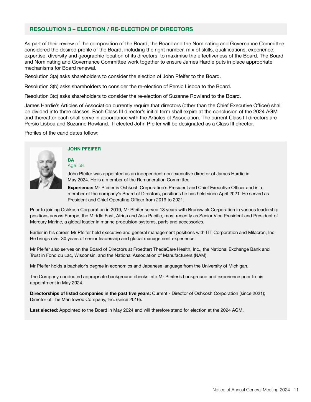 Forward-looking statements are based on the Company’s current expectations, estimates and assumptions and because forward-looking statements address future results, events and conditions, they, by their very nature, involve inherent risks and uncertainties, many of which are unforeseeable and beyond the Company’s control. Such known and unknown risks, uncertainties and other factors may cause actual results, performance or other achievements to differ materially from the anticipated results, performance or achievements expressed, projected or implied by these forward-looking statements. These factors, some of which are discussed under “Risk Factors” in Section 3 of the Form 20-F filed with the Securities and Exchange Commission on 20 May 2024, include, but are not limited to: all matters relating to or arising out of the prior manufacture of products that contained asbestos by current and former Company subsidiaries; required contributions to AICF, any shortfall in AICF funding and the effect of currency exchange rate movements on the amount recorded in the Company’s financial statements as an asbestos liability; compliance with and changes in tax laws and treatments; competition and product pricing in the markets in which the Company operates; the consequences of product failures or defects; exposure to environmental, asbestos, putative consumer class action or other legal proceedings; general economic and market conditions; the supply and cost of raw materials; possible increases in competition and the potential that competitors could copy the Company’s products; compliance with and changes in environmental and health and safety laws; risks of conducting business internationally; compliance with and changes in laws and regulations; currency exchange risks; dependence on customer preference and the concentration of the Company’s customer base; dependence on residential and commercial construction markets; the effect of adverse changes in climate or weather patterns; use of accounting estimates; and all other risks identified in the Company’s reports filed with Australian, Irish and US securities regulatory agencies and exchanges (as appropriate). The Company cautions you that the foregoing list of factors is not exhaustive and that other risks and uncertainties may cause actual results to differ materially from those referenced in the Company’s forward-looking statements. Forward-looking statements speak only as of the date they are made and are statements of the Company’s current expectations concerning future results, events and conditions. The Company assumes no obligation to update any forward-looking statements or information except as required by law.