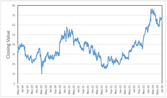 The following graph sets forth the historical performance of the common stock of Uber Technologies, Inc. based on the daily historical closing values from January 1, 2019 through July 10, 2024. We obtained the closing values below from Bloomberg. We have not undertaken any independent review of, or made any due diligence inquiry with respect to, the information obtained from Bloomberg.