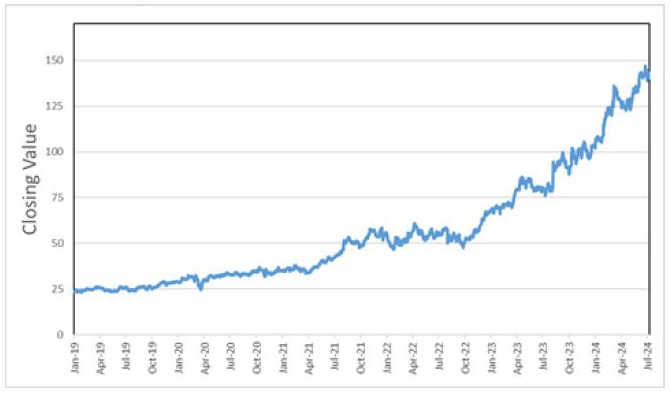 The following graph sets forth the historical performance of the American depositary receipts of Novo Nordisk A/S based on the daily historical closing values from January 1, 2019 through July 10, 2024. We obtained the closing values below from Bloomberg. We have not undertaken any independent review of, or made any due diligence inquiry with respect to, the information obtained from Bloomberg.