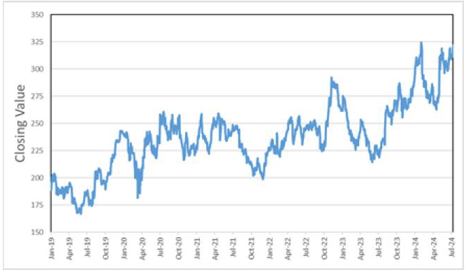 The following graph sets forth the historical performance of the common stock of Amgen Inc. based on the daily historical closing values from January 1, 2019 through July 10, 2024. We obtained the closing values below from Bloomberg. We have not undertaken any independent review of, or made any due diligence inquiry with respect to, the information obtained from Bloomberg.