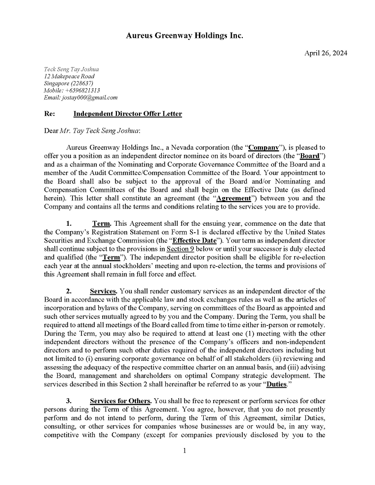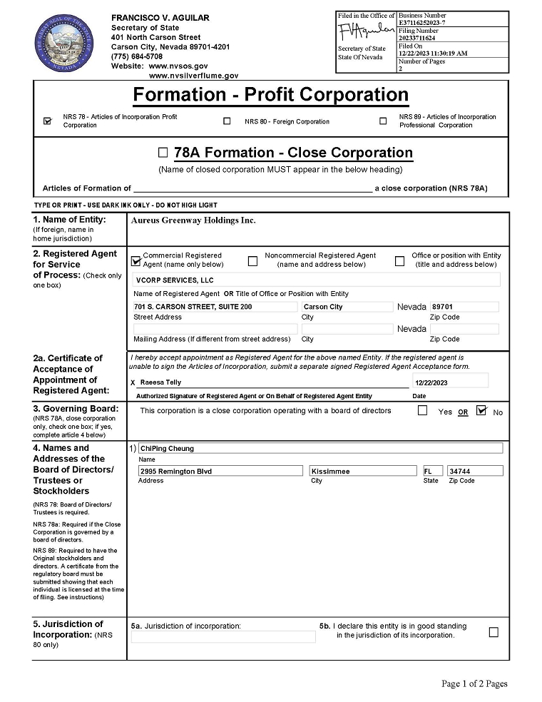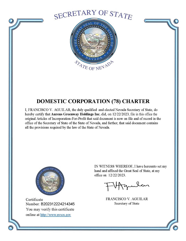 “Aureus Greenway” “our business”, “our Company”, “Company”, “we”, “us”, “our” and “Group” refers to Aureus Greenway Holdings Inc., a corporation incorporated under the laws of the State of Nevada and, unless the context requires otherwise, its subsidiaries;