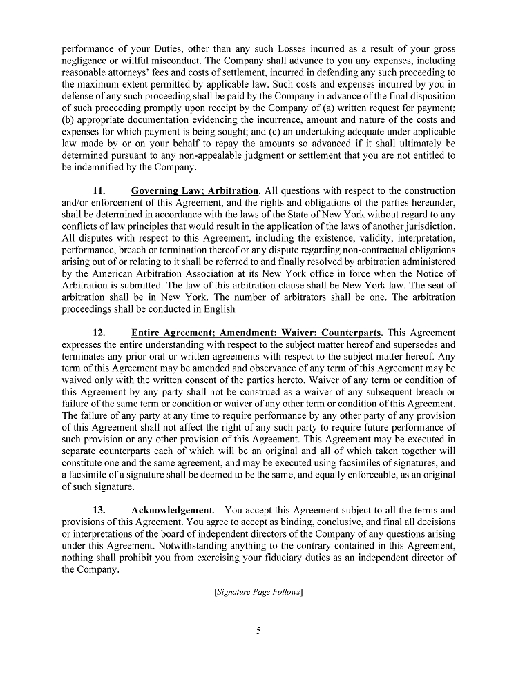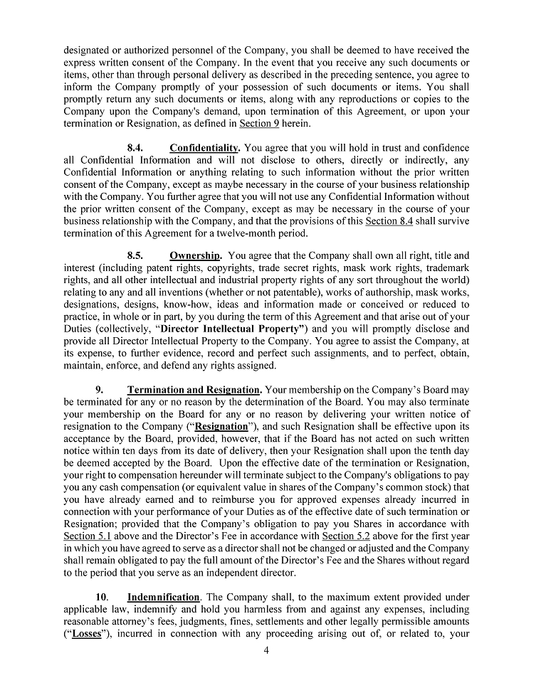 Unless otherwise restricted by the articles of incorporation, bylaws, or an agreement made by the corporation, Section 78.751 of the NRS provides that a corporation may pay expenses as incurred and in advance of the final disposition of the action, suit, or proceeding, upon receipt of an undertaking by or on behalf of the officer or director to repay the amount if it is ultimately determined by a court of competent jurisdiction that such officer or director is not entitled to be indemnified by the company. Section 78.751 of the NRS further permits the corporation to grant its directors and officers additional rights of indemnification under its articles of incorporation, bylaws, or other agreement, including the requirement of mandatory advance payment of expenses.