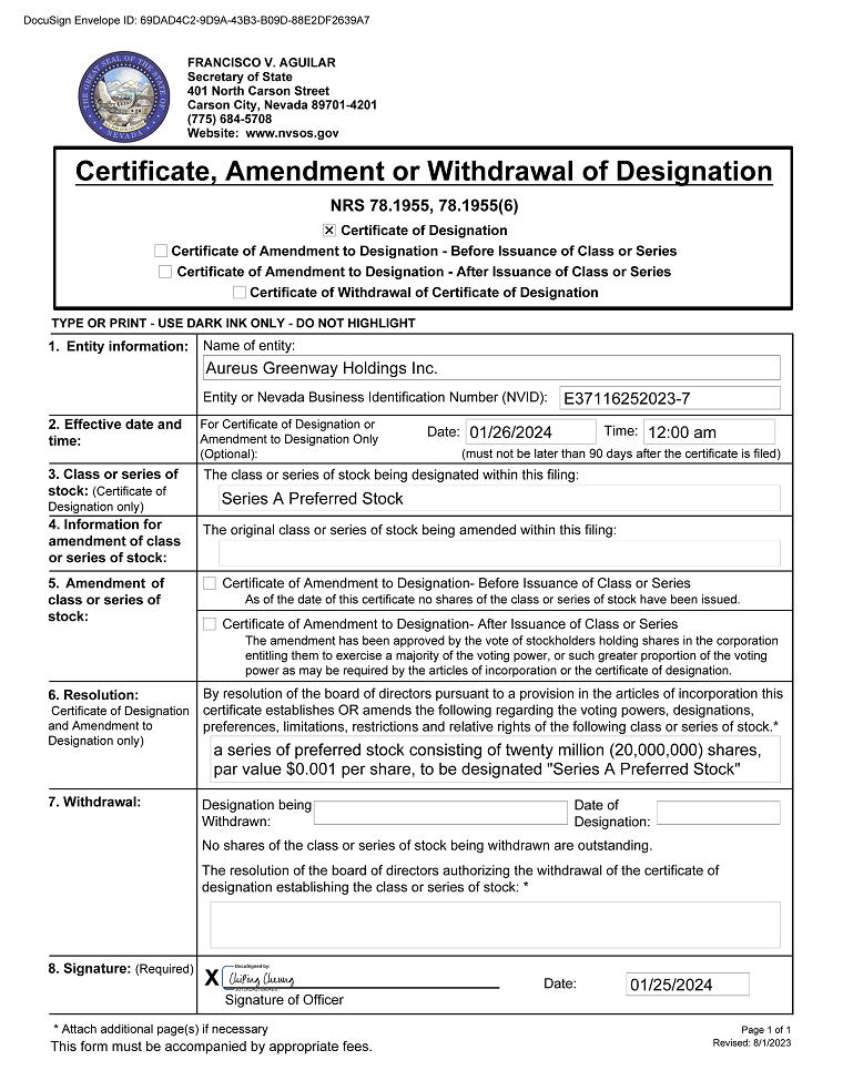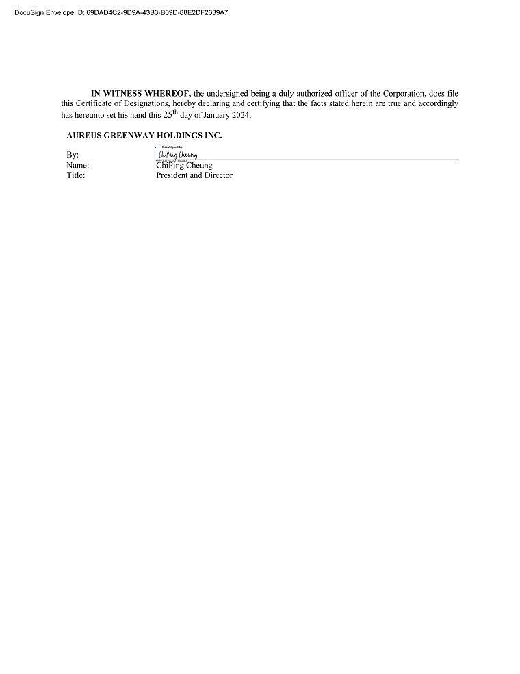| ● | Aureus Greenway Holdings Inc. was incorporated on December 22, 2023. In connection with the incorporation, on January 17, 2024, we issued (i) a total of 8,160,000 shares of common stock to Ace Champion Investments Limited (as to 6,800,000 shares of common stock), and Trendy View Assets Management (as to 1,360,000 shares of common stock), for total consideration of $8,160, (ii) a total of 10,000,000 shares of our Series A Preferred Stock to Ace Champion Investments Limited (as to 5,000,000 shares of Series A Preferred Stock), Trendy View Assets Management (as to 1,000,000 shares of Series A Preferred Stock), and Chrome Fields Asset Management LLC (as to 5,000,000 shares of Series A Preferred Stock), for total consideration of $10,000, and (iii) 5,440,000 shares of common stock to Chrome Fields Asset Management LLC, in exchange for the right to receive 100 ordinary shares, par value $1.00 of Pine Ridge Group Limited. The transactions were not registered under the Securities Act in reliance on an exemption from registration set forth in Section 4(a)(2) and/or Regulation D and/or Regulation S thereof. |