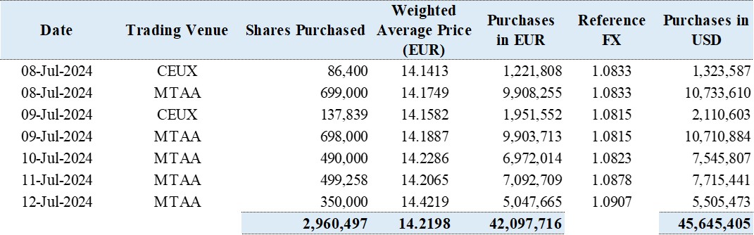 From July 8, 2024 to (and including) July 12, 2024, the Company has purchased a total of 2,960,497 ordinary shares for a total consideration of €42,097,716, equivalent to USD45,645,405.
