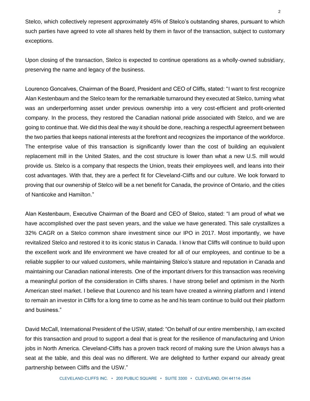 CLEVELAND-CLIFFS INC. • 200 PUBLIC SQUARE • SUITE 3300 • CLEVELAND, OH 44114-2544 2 Stelco, which collectively represent approximately 45% of Stelco’s outstanding shares, pursuant to which such parties have agreed to vote all shares held by them in favor of the transaction, subject to customary exceptions. Upon closing of the transaction, Stelco is expected to continue operations as a wholly-owned subsidiary, preserving the name and legacy of the business. Lourenco Goncalves, Chairman of the Board, President and CEO of Cliffs, stated: “I want to first recognize Alan Kestenbaum and the Stelco team for the remarkable turnaround they executed at Stelco, turning what was an underperforming asset under previous ownership into a very cost-efficient and profit-oriented company. In the process, they restored the Canadian national pride associated with Stelco, and we are going to continue that. We did this deal the way it should be done, reaching a respectful agreement between the two parties that keeps national interests at the forefront and recognizes the importance of the workforce. The enterprise value of this transaction is significantly lower than the cost of building an equivalent replacement mill in the United States, and the cost structure is lower than what a new U.S. mill would provide us. Stelco is a company that respects the Union, treats their employees well, and leans into their cost advantages. With that, they are a perfect fit for Cleveland-Cliffs and our culture. We look forward to proving that our ownership of Stelco will be a net benefit for Canada, the province of Ontario, and the cities of Nanticoke and Hamilton.” Alan Kestenbaum, Executive Chairman of the Board and CEO of Stelco, stated: “I am proud of what we have accomplished over the past seven years, and the value we have generated. This sale crystallizes a 32% CAGR on a Stelco common share investment since our IPO in 2017. Most importantly, we have revitalized Stelco and restored it to its iconic status in Canada. I know that Cliffs will continue to build upon the excellent work and life environment we have created for all of our employees, and continue to be a reliable supplier to our valued customers, while maintaining Stelco’s stature and reputation in Canada and maintaining our Canadian national interests. One of the important drivers for this transaction was receiving a meaningful portion of the consideration in Cliffs shares. I have strong belief and optimism in the North American steel market. I believe that Lourenco and his team have created a winning platform and I intend to remain an investor in Cliffs for a long time to come as he and his team continue to build out their platform and business.” David McCall, International President of the USW, stated: “On behalf of our entire membership, I am excited for this transaction and proud to support a deal that is great for the resilience of manufacturing and Union jobs in North America. Cleveland-Cliffs has a proven track record of making sure the Union always has a seat at the table, and this deal was no different. We are delighted to further expand our already great partnership between Cliffs and the USW.”