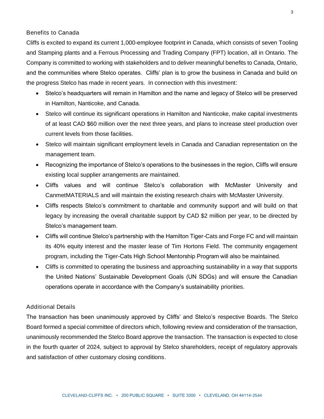 CLEVELAND-CLIFFS INC. • 200 PUBLIC SQUARE • SUITE 3300 • CLEVELAND, OH 44114-2544 3 Benefits to Canada Cliffs is excited to expand its current 1,000-employee footprint in Canada, which consists of seven Tooling and Stamping plants and a Ferrous Processing and Trading Company (FPT) location, all in Ontario. The Company is committed to working with stakeholders and to deliver meaningful benefits to Canada, Ontario, and the communities where Stelco operates. Cliffs’ plan is to grow the business in Canada and build on the progress Stelco has made in recent years. In connection with this investment: • Stelco’s headquarters will remain in Hamilton and the name and legacy of Stelco will be preserved in Hamilton, Nanticoke, and Canada. • Stelco will continue its significant operations in Hamilton and Nanticoke, make capital investments of at least CAD $60 million over the next three years, and plans to increase steel production over current levels from those facilities. • Stelco will maintain significant employment levels in Canada and Canadian representation on the management team. • Recognizing the importance of Stelco’s operations to the businesses in the region, Cliffs will ensure existing local supplier arrangements are maintained. • Cliffs values and will continue Stelco’s collaboration with McMaster University and CanmetMATERIALS and will maintain the existing research chairs with McMaster University. • Cliffs respects Stelco’s commitment to charitable and community support and will build on that legacy by increasing the overall charitable support by CAD $2 million per year, to be directed by Stelco’s management team. • Cliffs will continue Stelco’s partnership with the Hamilton Tiger-Cats and Forge FC and will maintain its 40% equity interest and the master lease of Tim Hortons Field. The community engagement program, including the Tiger-Cats High School Mentorship Program will also be maintained. • Cliffs is committed to operating the business and approaching sustainability in a way that supports the United Nations’ Sustainable Development Goals (UN SDGs) and will ensure the Canadian operations operate in accordance with the Company’s sustainability priorities. Additional Details The transaction has been unanimously approved by Cliffs’ and Stelco’s respective Boards. The Stelco Board formed a special committee of directors which, following review and consideration of the transaction, unanimously recommended the Stelco Board approve the transaction. The transaction is expected to close in the fourth quarter of 2024, subject to approval by Stelco shareholders, receipt of regulatory approvals and satisfaction of other customary closing conditions.