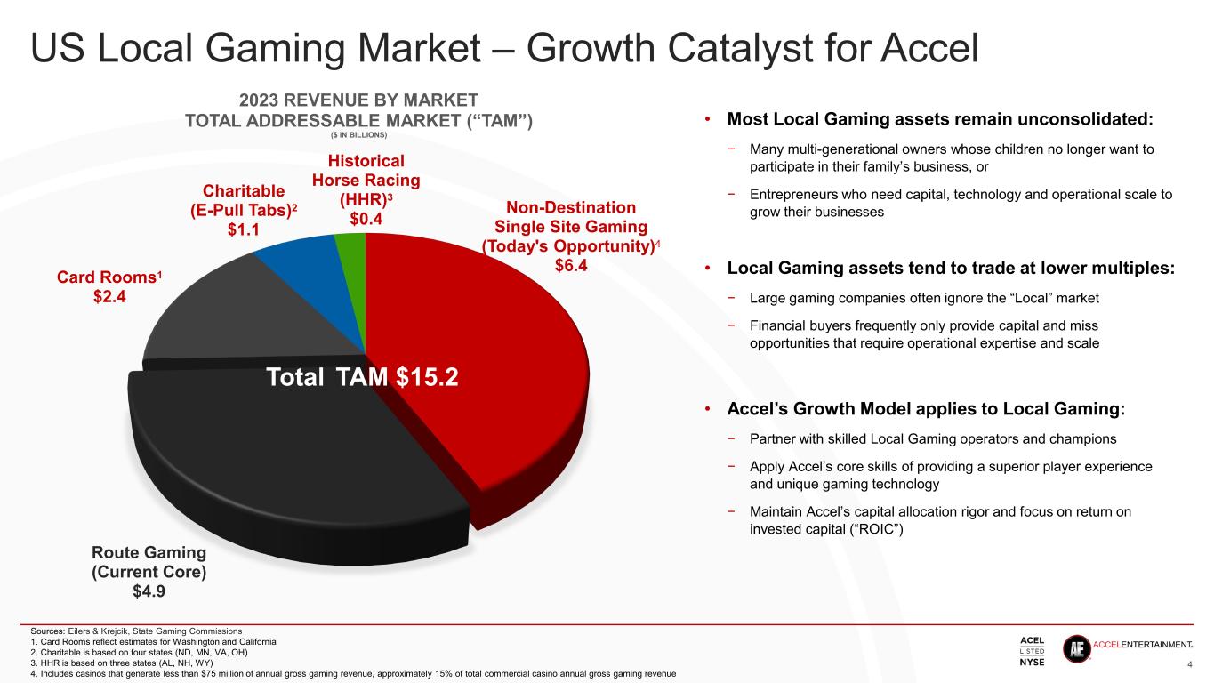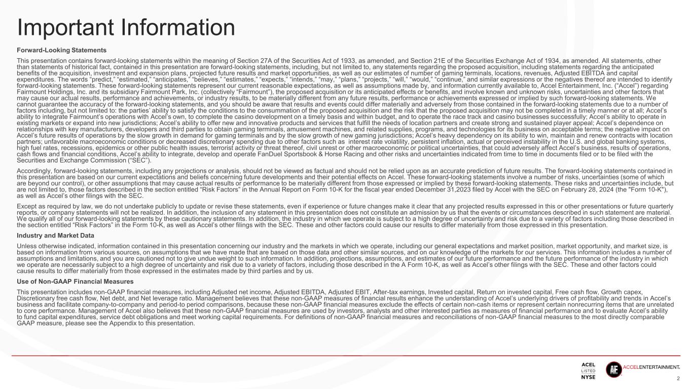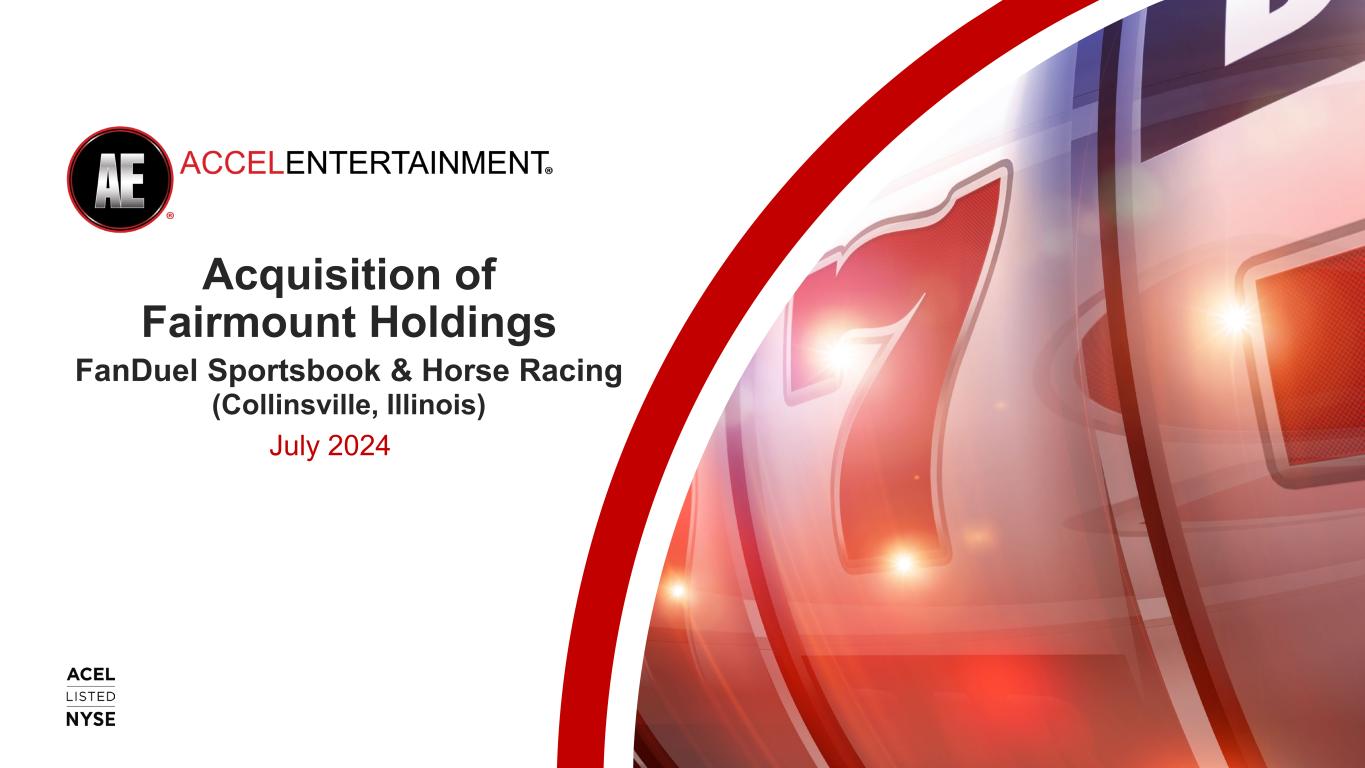 Important Information Forward-Looking Statements This presentation contains forward-looking statements within the meaning of Section 27A of the Securities Act of 1933, as amended, and Section 21E of the Securities Exchange Act of 1934, as amended. All statements, other than statements of historical fact, contained in this presentation are forward-looking statements, including, but not limited to, any statements regarding the proposed acquisition, including statements regarding the anticipated benefits of the acquisition, investment and expansion plans, projected future results and market opportunities, as well as our estimates of number of gaming terminals, locations, revenues, Adjusted EBITDA and capital expenditures. The words “predict,” “estimated,” “anticipates,” “believes,” “estimates,” “expects,” “intends,” “may,” “plans,” “projects,” “will,” “would,” “continue,” and similar expressions or the negatives thereof are intended to identify forward-looking statements. These forward-looking statements represent our current reasonable expectations, as well as assumptions made by, and information currently available to, Accel Entertainment, Inc. (“Accel”) regarding Fairmount Holdings, Inc. and its subsidiary Fairmount Park, Inc. (collectively “Fairmount”), the proposed acquisition or its anticipated effects or benefits, and involve known and unknown risks, uncertainties and other factors that may cause our actual results, performance and achievements, or industry results, to be materially different from any future results, performance or achievements expressed or implied by such forward-looking statements. We cannot guarantee the accuracy of the forward-looking statements, and you should be aware that results and events could differ materially and adversely from those contained in the forward-looking statements due to a number of factors including, but not limited to: the parties’ ability to satisfy the conditions to the consummation of the proposed acquisition and the risk that the proposed acquisition may not be completed in a timely manner or at all; Accel’s ability to integrate Fairmount’s operations with Accel’s own, to complete the casino development on a timely basis and within budget, and to operate the race track and casino businesses successfully; Accel’s ability to operate in existing markets or expand into new jurisdictions; Accel’s ability to offer new and innovative products and services that fulfill the needs of location partners and create strong and sustained player appeal; Accel’s dependence on relationships with key manufacturers, developers and third parties to obtain gaming terminals, amusement machines, and related supplies, programs, and technologies for its business on acceptable terms; the negative impact on Accel’s future results of operations by the slow growth in demand for gaming terminals and by the slow growth of new gaming jurisdictions; Accel’s heavy dependency on its ability to win, maintain and renew contracts with location partners; unfavorable macroeconomic conditions or decreased discretionary spending due to other factors such as interest rate volatility, persistent inflation, actual or perceived instability in the U.S. and global banking systems, high fuel rates, recessions, epidemics or other public health issues, terrorist activity or threat thereof, civil unrest or other macroeconomic or political uncertainties, that could adversely affect Accel’s business, results of operations, cash flows and financial conditions, Accel’s ability to integrate, develop and operate FanDuel Sportsbook & Horse Racing and other risks and uncertainties indicated from time to time in documents filed or to be filed with the Securities and Exchange Commission (“SEC”). Accordingly, forward-looking statements, including any projections or analysis, should not be viewed as factual and should not be relied upon as an accurate prediction of future results. The forward-looking statements contained in this presentation are based on our current expectations and beliefs concerning future developments and their potential effects on Accel. These forward-looking statements involve a number of risks, uncertainties (some of which are beyond our control), or other assumptions that may cause actual results or performance to be materially different from those expressed or implied by these forward-looking statements. These risks and uncertainties include, but are not limited to, those factors described in the section entitled “Risk Factors” in the Annual Report on Form 10-K for the fiscal year ended December 31,2023 filed by Accel with the SEC on February 28, 2024 (the "Form 10-K"), as well as Accel’s other filings with the SEC. Except as required by law, we do not undertake publicly to update or revise these statements, even if experience or future changes make it clear that any projected results expressed in this or other presentations or future quarterly reports, or company statements will not be realized. In addition, the inclusion of any statement in this presentation does not constitute an admission by us that the events or circumstances described in such statement are material. We qualify all of our forward-looking statements by these cautionary statements. In addition, the industry in which we operate is subject to a high degree of uncertainty and risk due to a variety of factors including those described in the section entitled “Risk Factors” in the Form 10-K, as well as Accel’s other filings with the SEC. These and other factors could cause our results to differ materially from those expressed in this presentation. Industry and Market Data Unless otherwise indicated, information contained in this presentation concerning our industry and the markets in which we operate, including our general expectations and market position, market opportunity, and market size, is based on informatio