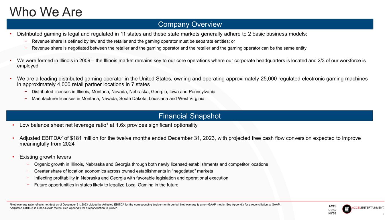 US Local Gaming Market – Growth Catalyst for Accel 4 Sources: Eilers & Krejcik, State Gaming Commissions 1. Card Rooms reflect estimates for Washington and California 2. Charitable is based on four states (ND, MN, VA, OH) 3. HHR is based on three states (AL, NH, WY) 4. Includes casinos that generate less than $75 million of annual gross gaming revenue, approximately 15% of total commercial casino annual gross gaming revenue • Most Local Gaming assets remain unconsolidated: − Many multi-generational owners whose children no longer want to participate in their family’s business, or − Entrepreneurs who need capital, technology and operational scale to grow their businesses • Local Gaming assets tend to trade at lower multiples: − Large gaming companies often ignore the “Local” market − Financial buyers frequently only provide capital and miss opportunities that require operational expertise and scale • Accel’s Growth Model applies to Local Gaming: − Partner with skilled Local Gaming operators and champions − Apply Accel’s core skills of providing a superior player experience and unique gaming technology − Maintain Accel’s capital allocation rigor and focus on return on invested capital (“ROIC”) Non-Destination Single Site Gaming (Today's Opportunity)4 $6.4 Route Gaming (Current Core) $4.9 Card Rooms1 $2.4 Charitable (E-Pull Tabs)2 $1.1 Historical Horse Racing (HHR)3 $0.4 2023 REVENUE BY MARKET TOTAL ADDRESSABLE MARKET (“TAM”) ($ IN BILLIONS) Total TAM $15.2