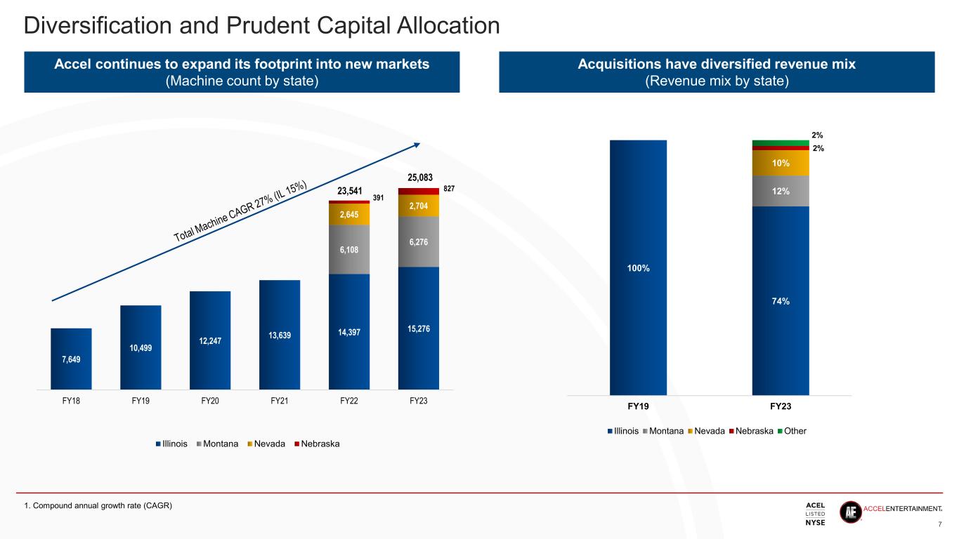 • Focus on Customer Relationships − Exceptional infrastructure to support our retail partners’ growth, including relationship management, business development and data analytics/reporting − Self-service technology to lessen staffing burdens for our retail partners − Gaming marketing to improve retail partners’ recognition amongst the player community • Instill Player Loyalty − Create memorable player experiences within our retail partners’ locations − Reward players with meaningful events and gifts (where compliant) • Form collaborative and reliable partnerships with our regulators (11 different regulatory structures) How We Create Value 6 • Extensive track record of deploying capital to third party partners − Since 2012, we have created a robust capital allocation process that identifies and approves hundreds of retail locations per year to receive gaming equipment, systems, support and service with a targeted 1.5 year payback period − Purchased approximately 85 operating companies since 2009 at accretive synergized multiples • Scorecard of successful capital allocation − Steady share repurchases – as of March 31, 2024, Accel has purchased a total of 12 million shares at a cost of approximately $124 million − Our return on invested capital (“ROIC”) 1 is well above cost of capital at 13% Capital Allocation Core Operations 1 ROIC is a non-GAAP metric. See Appendix for a reconciliation to GAAP.