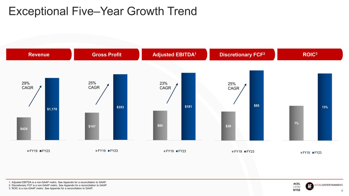 Diversification and Prudent Capital Allocation 7 Accel continues to expand its footprint into new markets (Machine count by state) Acquisitions have diversified revenue mix (Revenue mix by state) 1. Compound annual growth rate (CAGR) 7,649 10,499 12,247 13,639 14,397 15,276 6,108 6,276 2,645 2,704 391 82723,541 25,083 FY18 FY19 FY20 FY21 FY22 FY23 Illinois Montana Nevada Nebraska 100% 74% 12% 10% 2% 2% FY19 FY23 Illinois Montana Nevada Nebraska Other