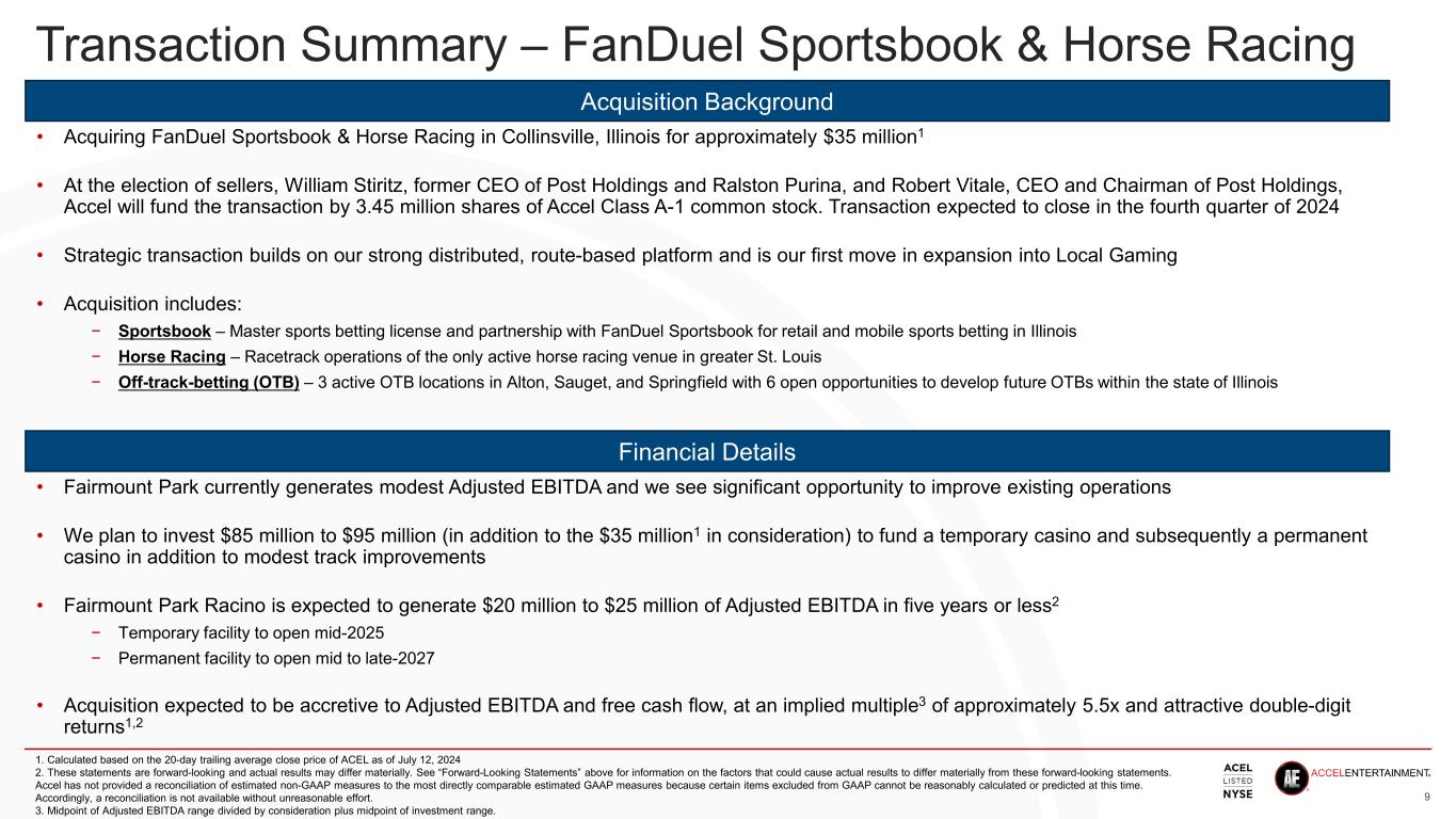 Acquisition of Fairmount Holdings 3 Extends Accel’s Local Gaming footprint with the purchase of the only active horse racing venue in greater St. Louis; includes an Organization Gaming License to offer casino gaming positions as well as a partnership with FanDuel to participate in sport wagering in Illinois • Purchasing Fairmount Holdings, Inc. (“Fairmount”), the owner of the FanDuel Sportsbook & Horse Racing, for 3.45 million shares of Accel Class A-1 common stock (approximately $35 million1 consideration) from co-owners William Stiritz, former CEO of Post Holdings and Ralston Purina, and Robert Vitale, current CEO and Chairman of Post Holdings • Building on Accel’s strong distributed ‘route-based’ platform with advantaged, single-site Local Gaming asset – one of only two active horse racing venues in Illinois and the only one in the greater St. Louis/southern Illinois market • Acquiring: • an active racetrack with 65 race days and approximately 435 horse races annually • an opportunity to develop a legislatively authorized casino project, and • a master sports betting license used in a revenue share agreement with FanDuel • Implementing a capital efficient plan to build several phases of casino facilities, improve the overall quality of horse racing for owners and trainers, improve the experience for fans and participants, and partner with food & beverage (F&B) specialists to build out Fairmount’s F&B offerings • Engaged industry-leading partnerships to drive success, including: • RRC Gaming Management LLC, including Tony Rodio, former CEO of Caesars Entertainment • Holly Gagnon, current CEO of HGC Gaming Hospitality and former CEO of several casino companies, including the Seneca Gaming Corporation • Transaction is a compelling deal with an advantaged single-site, real estate light Local Gaming asset – focused on convenience, with favorable competitive dynamics and lower capex requirements, and leveraging Accel’s expertise in player experience, cash logistics, regulatory compliance and capital allocation 1. Calculated based on the 20-day trailing average close price of ACEL as of July 12, 2024
