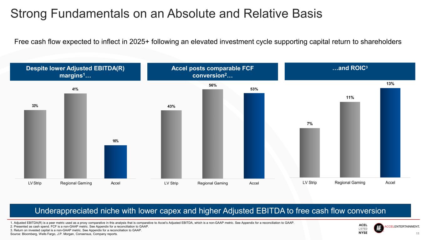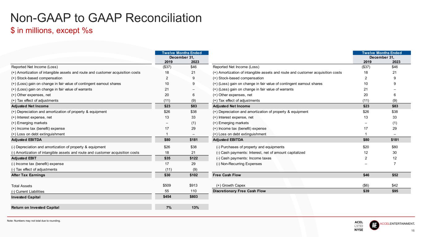 Definition of Non-GAAP Financial Measures Adjusted net income is defined as net income (loss) plus: • Amortization of intangible assets and route and customer acquisition costs • Stock-based compensation expense • (Loss) gain on change in fair value of contingent earnout shares • (Loss) gain on change in fair value of warrants • Other expenses, net – consists of (i) non-cash expenses including the remeasurement of contingent consideration liabilities, (ii) non-recurring lobbying and legal expenses related to distributed gaming expansion in current or prospective markets, and (iii) other non-recurring expenses • Tax effect of adjustments Adjusted EBITDA is defined as net income (loss) plus: • Amortization of intangible assets and route and customer acquisition costs • Stock-based compensation expense • (Loss) gain on change in fair value of contingent earnout shares • (Loss) gain on change in fair value of warrants • Other expenses, net • Tax effect of adjustments • Depreciation and amortization of property and equipment • Interest expense • Emerging markets – reflects the results, on an Adjusted EBITDA basis, for non-core jurisdictions where our operations are developing − Markets are no longer considered emerging when we have installed or acquired at least 500 gaming terminals in the jurisdiction, or when 24 months have elapsed from the date we first install or acquire gaming terminals in the jurisdiction, whichever occurs first − We currently view Pennsylvania as an emerging market − Prior to January 2024, Iowa was considered an emerging market − Prior to April 2023, Nebraska was considered an emerging market • Income tax expense • Loss on debt extinguishment 15 Accel uses non-GAAP measures as a key performance measure of the results of operations for purposes of evaluating performance internally. Management believes that these non-GAAP measures of financial results enhance the understanding of Accel’s underlying drivers of profitability and trends in Accel’s business and facilitate company-to-company and period-to period comparisons, because these non-GAAP financial measures exclude the effects of certain non-cash items or represent certain nonrecurring items that are unrelated to core performance. Management of Accel also believes that these non- GAAP financial measures are used by investors, analysts and other interested parties as measures of financial performance and to evaluate Accel’s ability to fund capital expenditures, service debt obligations and meet working capital requirements. Adjusted EBIT is defined as Adjusted EBITDA less: • Depreciation and amortization of property and equipment • Amortization of intangible assets and route and customer acquisition costs After-tax earnings is defined as Adjusted EBIT less: • Income tax (benefit) expense • Tax effect of adjustments Invested capital is defined as total assets, less current liabilities Return on invested capital is a ratio of after-tax earnings divided by invested capital Free cash flow is defined as Adjusted EBITDA less: • Purchases of property and equipment, net of proceeds from sales • Interest cash payments, net of amount capitalized • Income tax cash payments • Non-recurring expenses – represent certain nonrecurring items that are unrelated to core performance Growth capex is defined as purchases of property and equipment, net of proceeds from sales, less: • Depreciation and amortization of property & equipment Discretionary free cash flow is defined as free cash flow plus Growth capex Net debt is defined as debt, net of current maturities plus: • Current maturities of debt less cash and cash equivalents Net leverage ratio is a ratio of net debt to Adjusted EBITDA: • Net debt divided by Adjusted EBITDA