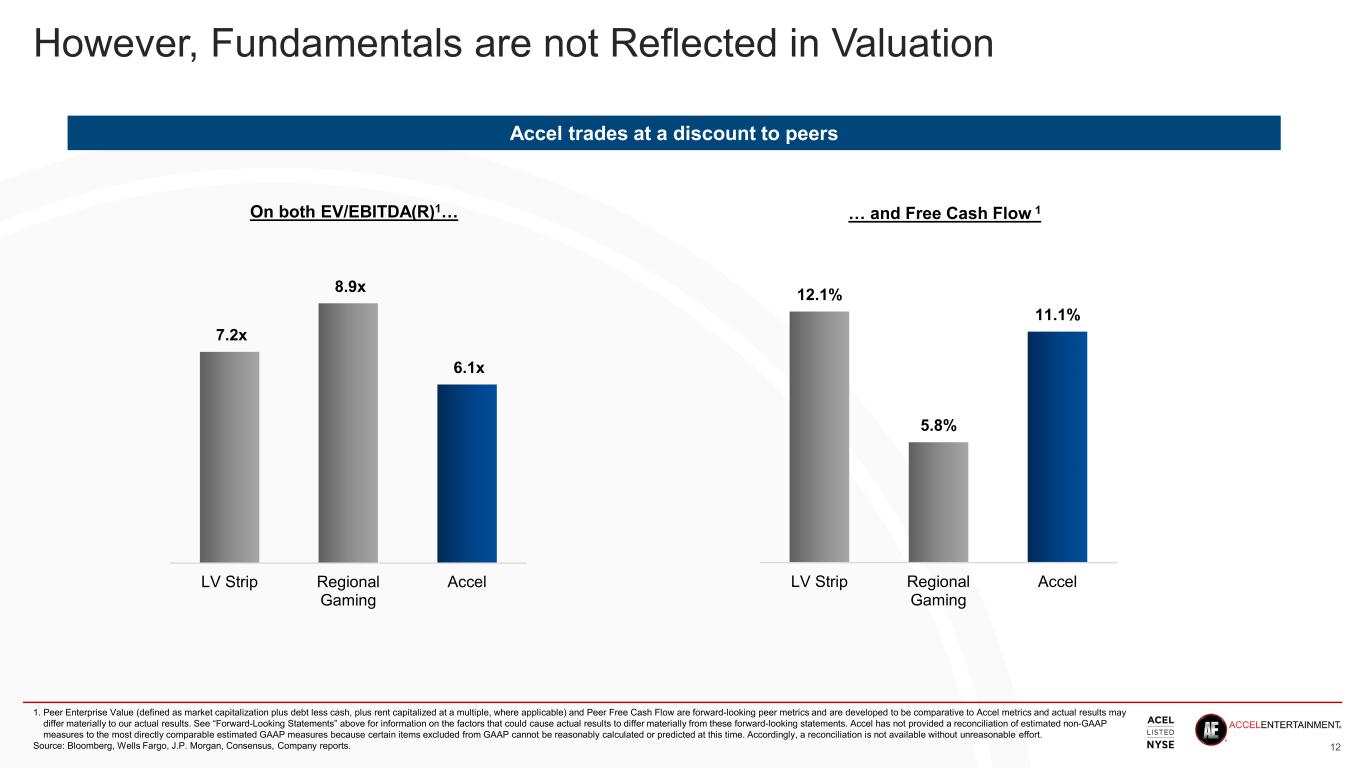 43% 56% 53% LV Strip Regional Gaming Accel Strong Fundamentals on an Absolute and Relative Basis 11 1. Adjusted EBITDA(R) is a peer metric used as a proxy comparative in this analysis that is comparative to Accel’s Adjusted EBITDA, which is a non-GAAP metric. See Appendix for a reconciliation to GAAP. 2. Presented as cash spend. FCF is a non-GAAP metric. See Appendix for a reconciliation to GAAP. 3. Return on invested capital is a non-GAAP metric. See Appendix for a reconciliation to GAAP. Source: Bloomberg, Wells Fargo, J.P. Morgan, Consensus, Company reports. Underappreciated niche with lower capex and higher Adjusted EBITDA to free cash flow conversion 33% 41% 16% LV Strip Regional Gaming Accel Despite lower Adjusted EBITDA(R) margins1… Accel posts comparable FCF conversion2… …and ROIC3 Free cash flow expected to inflect in 2025+ following an elevated investment cycle supporting capital return to shareholders 7% 11% 13% LV Strip Regional Gaming Accel