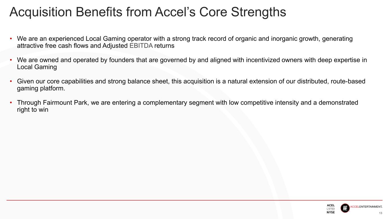 12.1% 5.8% 11.1% LV Strip Regional Gaming Accel 7.2x 8.9x 6.1x LV Strip Regional Gaming Accel However, Fundamentals are not Reflected in Valuation 12 Accel trades at a discount to peers On both EV/EBITDA(R)1… … and Free Cash Flow 1 1. Peer Enterprise Value (defined as market capitalization plus debt less cash, plus rent capitalized at a multiple, where applicable) and Peer Free Cash Flow are forward-looking peer metrics and are developed to be comparative to Accel metrics and actual results may differ materially to our actual results. See “Forward-Looking Statements” above for information on the factors that could cause actual results to differ materially from these forward-looking statements. Accel has not provided a reconciliation of estimated non-GAAP measures to the most directly comparable estimated GAAP measures because certain items excluded from GAAP cannot be reasonably calculated or predicted at this time. Accordingly, a reconciliation is not available without unreasonable effort. Source: Bloomberg, Wells Fargo, J.P. Morgan, Consensus, Company reports.