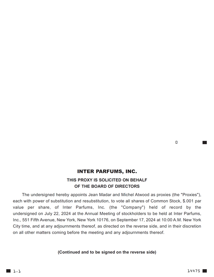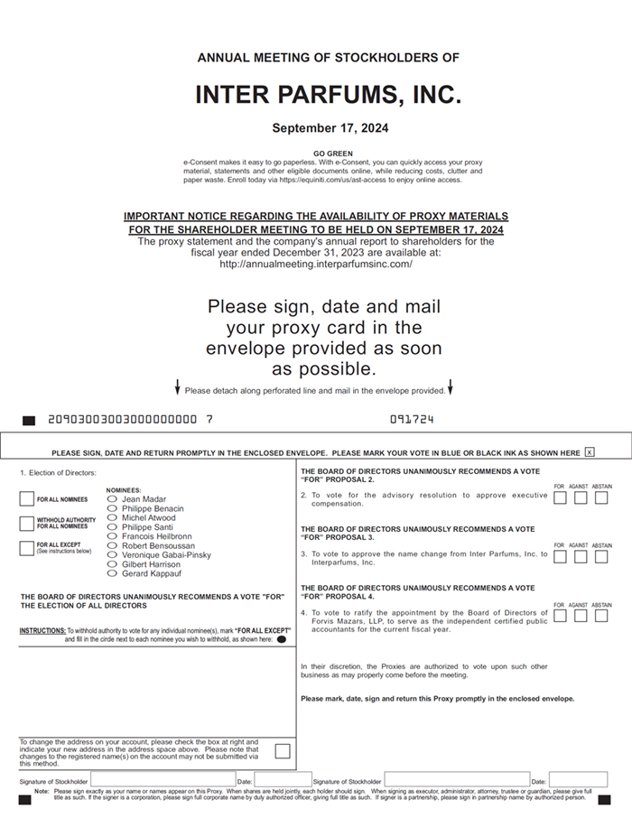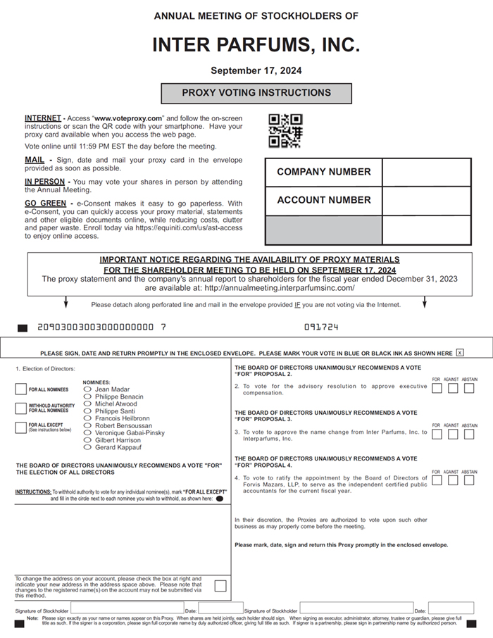 This proxy statement is furnished by the Board of Directors of our Company, Inter Parfums, Inc., a Delaware corporation, with offices located at 551 Fifth Avenue, New York, New York 10176, in connection with the solicitation of proxies to be used at the annual meeting of our shareholders being held on September 17, 2024 and at any adjournments of the annual meeting. For purposes of this proxy statement, unless the context otherwise indicates, the terms the “Company,” “us” or “our” refer to Inter Parfums, Inc.