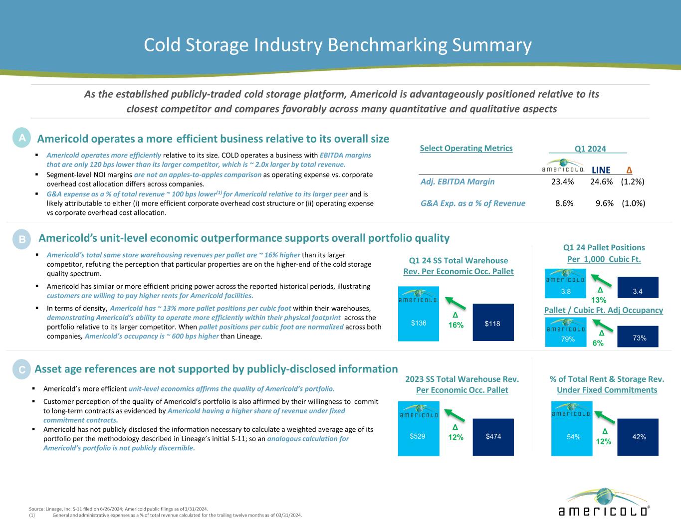 Cold Storage Industry Benchmarking Summary As the established publicly-traded cold storage platform, Americold is advantageously positioned relative to its closest competitor and compares favorably across many quantitative and qualitative aspects Americold operates more efficiently relative to its size. COLD operates a business with EBITDA margins that are only 120 bps lower than its larger competitor, which is ~ 2.0x larger by total revenue. Segment-level NOI margins are not an apples-to-apples comparison as operating expense vs. corporate overhead cost allocation differs across companies. G&A expense as a % of total revenue ~ 100 bps lower(1) for Americold relative to its larger peer and is likely attributable to either (i) more efficient corporate overhead cost structure or (ii) operating expense vs corporate overhead cost allocation. Americold operates a more efficient business relative to its overall sizeA LINE Δ Adj. EBITDA Margin 23.4% 24.6% (1.2%) G&A Exp. as a % of Revenue 8.6% 9.6% (1.0%) Select Operating Metrics Q1 2024 Americold’s total same store warehousing revenues per pallet are ~ 16% higher than its larger competitor, refuting the perception that particular properties are on the higher-end of the cold storage quality spectrum. Americold has similar or more efficient pricing power across the reported historical periods, illustrating customers are willing to pay higher rents for Americold facilities. In terms of density, Americold has ~ 13% more pallet positions per cubic foot within their warehouses, demonstrating Americold’s ability to operate more efficiently within their physical footprint across the portfolio relative to its larger competitor. When pallet positions per cubic foot are normalized across both companies, Americold’s occupancy is ~ 600 bps higher than Lineage. Americold’s unit-level economic outperformance supports overall portfolio qualityB C Americold’s more efficient unit-level economics affirms the quality of Americold’s portfolio. Customer perception of the quality of Americold’s portfolio is also affirmed by their willingness to commit to long-term contracts as evidenced by Americold having a higher share of revenue under fixed commitment contracts. Americold has not publicly disclosed the information necessary to calculate a weighted average age of its portfolio per the methodology described in Lineage’s initial S-11; so an analogous calculation for Americold’s portfolio is not publicly discernible. Asset age references are not supported by publicly-disclosed information D Q1 24 SS Total Warehouse Rev. Per Economic Occ. Pallet Δ 16% $118 Q1 24 Pallet Positions Per 1,000 Cubic Ft. $136 3.8 3.4 2023 SS Total Warehouse Rev. Per Economic Occ. Pallet % of Total Rent & Storage Rev. Under Fixed Commitments $474$529 54% 42% Source: Lineage, Inc. S-11 filed on 6/26/2024; Americold public filings as of 3/31/2024. (1) General and administrative expenses as a % of total revenue calculated for the trailing twelve months as of 03/31/2024. Δ 13% Δ 12% Δ 12% Pallet / Cubic Ft. Adj Occupancy 79% 73%Δ 6%