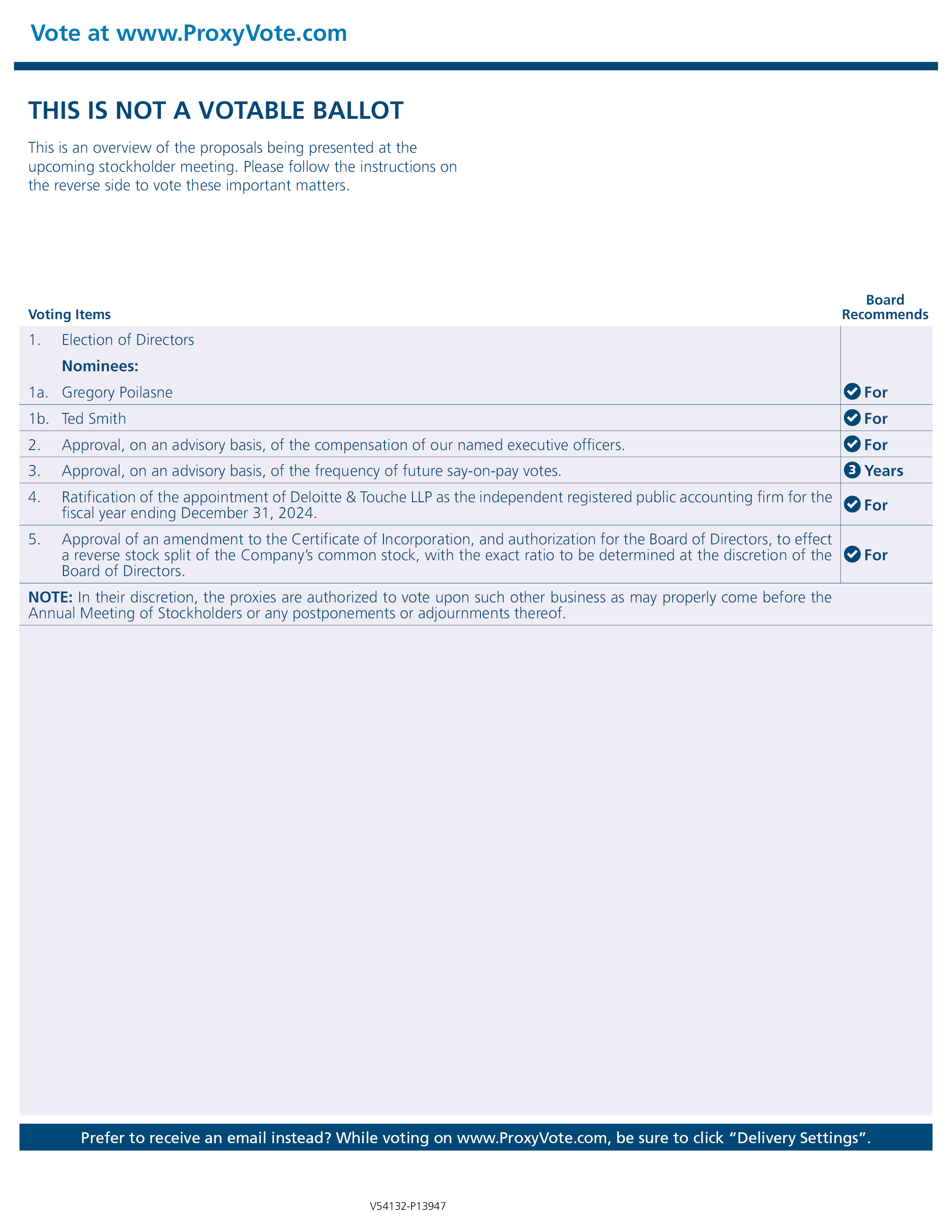 Vote at www.ProxyVote.com THIS IS NOT A VOTABLE BALLOT This is an overview of the proposals being presented at the upcoming stockholder meeting. Please follow the instructions on the reverse side to vote these important matters. Voting Items Board Recommends 1. Election of Directors For Nominees: 1a. Gregory Poilasne 1b. Ted Smith For 2. Approval, on an advisory basis, of the compensation of our named executive officers. For 3. Approval, on an advisory basis, of the frequency of future say-on-pay votes. 3 Years 4. Ratification of the appointment of Deloitte & Touche LLP as the independent registered public accounting firm for the fiscal year ending December 31, 2024. For 5. Approval of an amendment to the Certificate of Incorporation, and authorization for the Board of Directors, to effect a reverse stock split of the Company’s common stock, with the exact ratio to be determined at the discretion of the Board of Directors. For NOTE: In their discretion, the proxies are authorized to vote upon such other business as may properly come before the Annual Meeting of Stockholders or any postponements or adjournments thereof. Prefer to receive an email instead? While voting on www.ProxyVote.com, be sure to click “Delivery Settings”. V54132-P13947