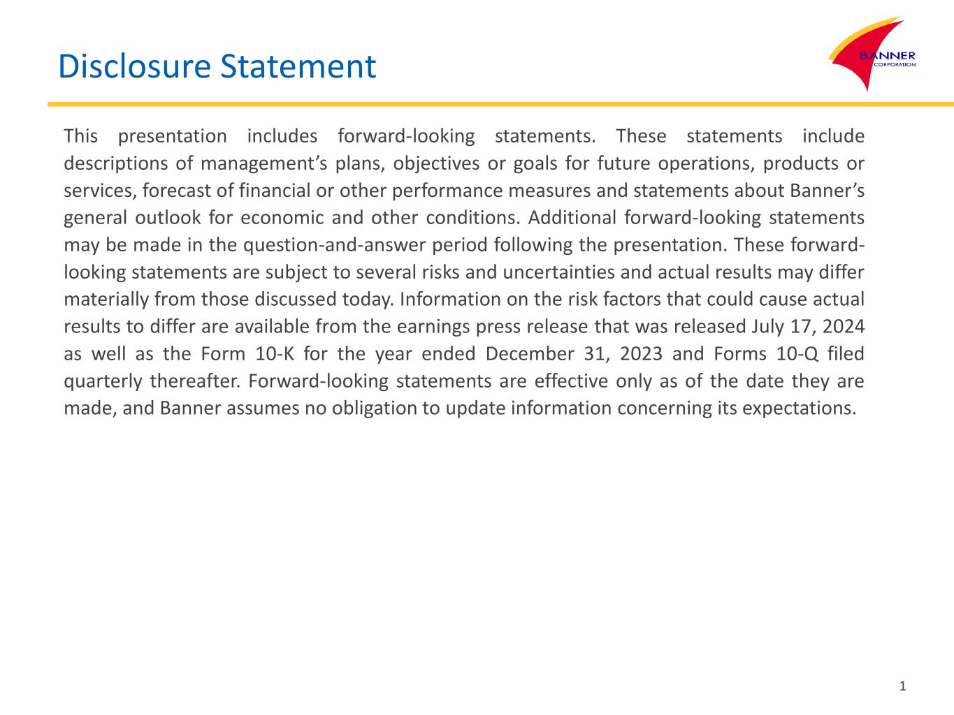Disclosure Statement 1 This presentation includes forward-looking statements. These statements include descriptions of management’s plans, objectives or goals for future operations, products or services, forecast of financial or other performance measures and statements about Banner’s general outlook for economic and other conditions. Additional forward-looking statements may be made in the question-and-answer period following the presentation. These forward- looking statements are subject to several risks and uncertainties and actual results may differ materially from those discussed today. Information on the risk factors that could cause actual results to differ are available from the earnings press release that was released July 17, 2024 as well as the Form 10-K for the year ended December 31, 2023 and Forms 10-Q filed quarterly thereafter. Forward-looking statements are effective only as of the date they are made, and Banner assumes no obligation to update information concerning its expectations.