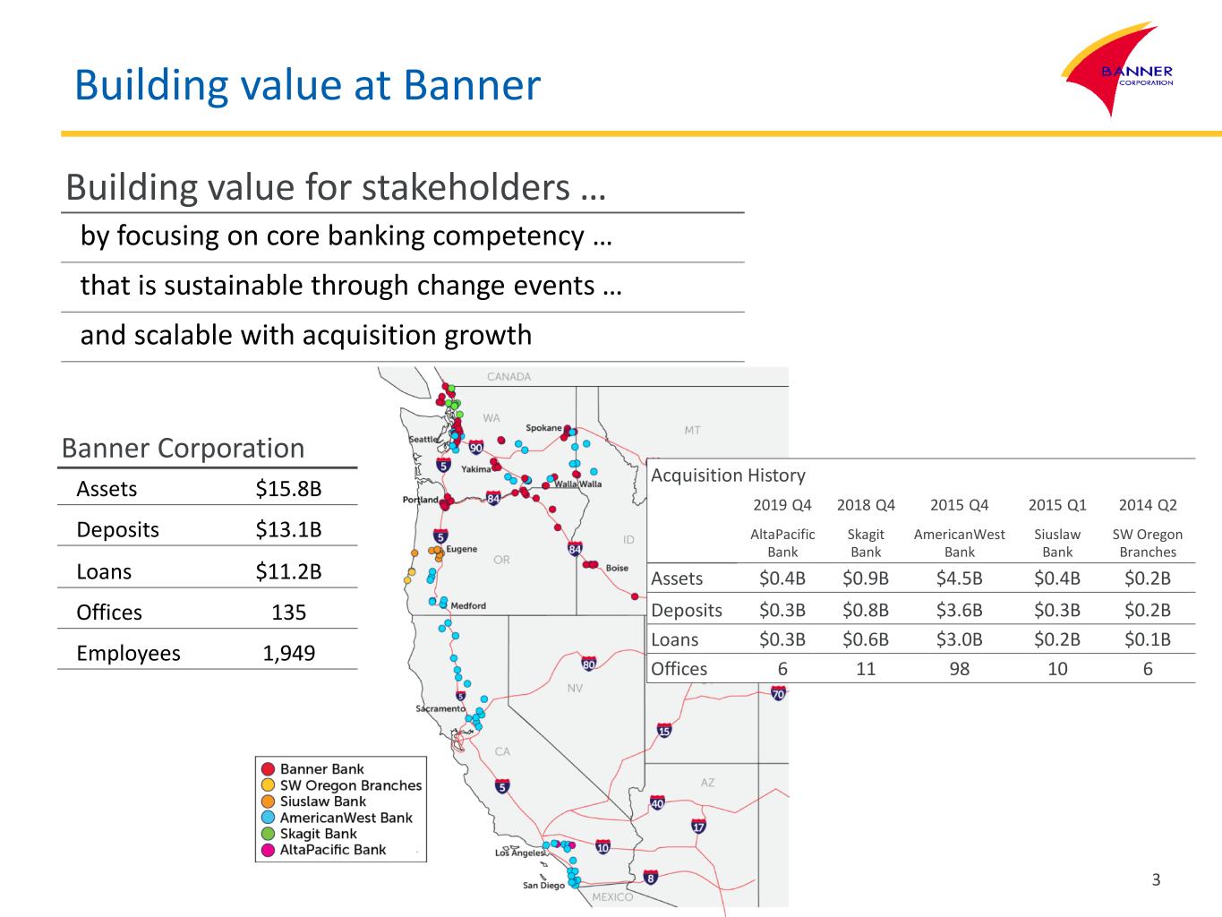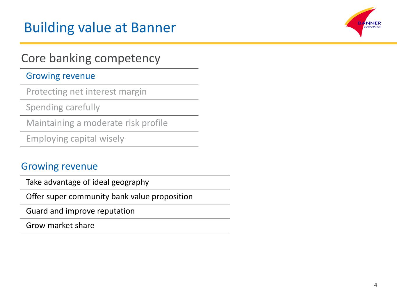Building value at Banner Building value for stakeholders … by focusing on core banking competency … that is sustainable through change events … and scalable with acquisition growth Banner Corporation Assets $15.8B Deposits $13.1B Loans $11.2B Offices 135 Employees 1,949 3 Acquisition History 2019 Q4 2018 Q4 2015 Q4 2015 Q1 2014 Q2 AltaPacific Bank Skagit Bank AmericanWest Bank Siuslaw Bank SW Oregon Branches Assets $0.4B $0.9B $4.5B $0.4B $0.2B Deposits $0.3B $0.8B $3.6B $0.3B $0.2B Loans $0.3B $0.6B $3.0B $0.2B $0.1B Offices 6 11 98 10 6