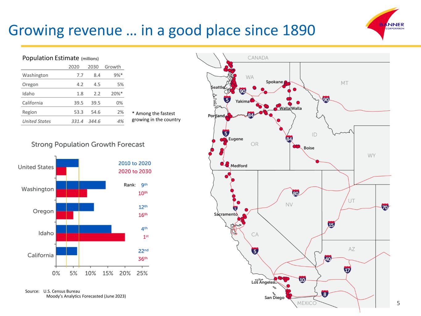 Building value at Banner Core banking competency Growing revenue Protecting net interest margin Spending carefully Maintaining a moderate risk profile Employing capital wisely Growing revenue Take advantage of ideal geography Offer super community bank value proposition Guard and improve reputation Grow market share 4