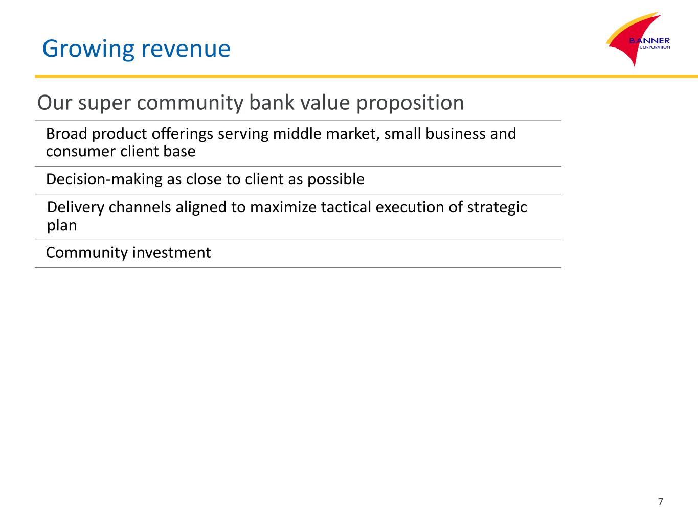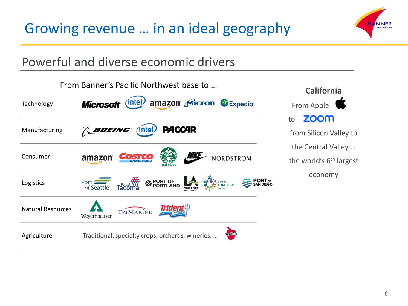 Growing revenue … in an ideal geography Powerful and diverse economic drivers From Banner’s Pacific Northwest base to … Technology Manufacturing Consumer Logistics Natural Resources Agriculture Traditional, specialty crops, orchards, wineries, … California From Apple to from Silicon Valley to the Central Valley … the world’s 6th largest economy 6