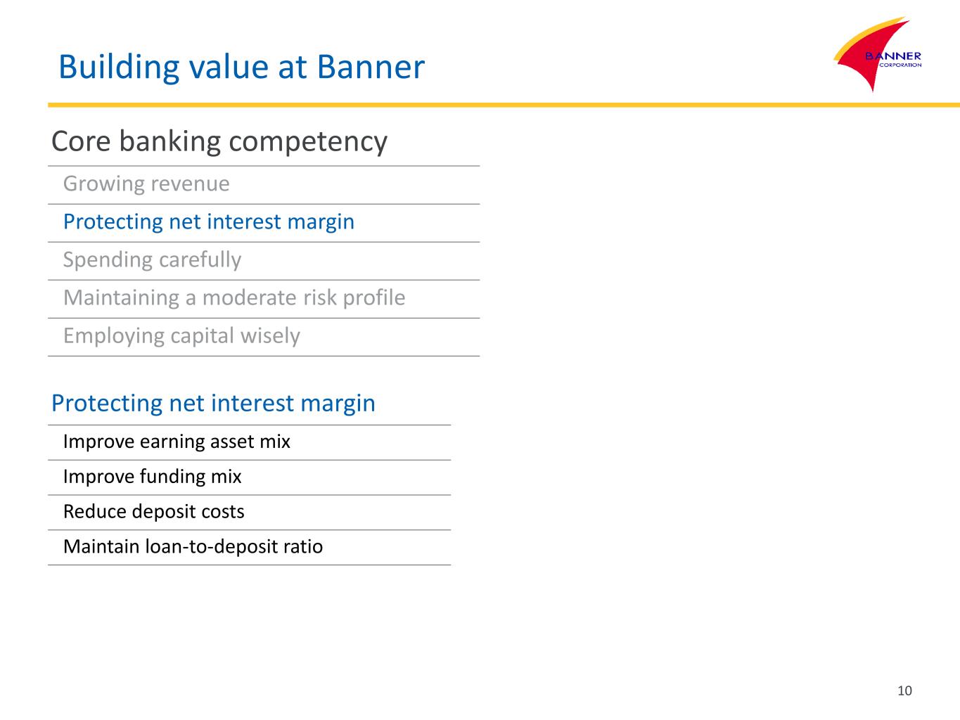 Building value at Banner Core banking competency Growing revenue Protecting net interest margin Spending carefully Maintaining a moderate risk profile Employing capital wisely Protecting net interest margin Improve earning asset mix Improve funding mix Reduce deposit costs Maintain loan-to-deposit ratio 10