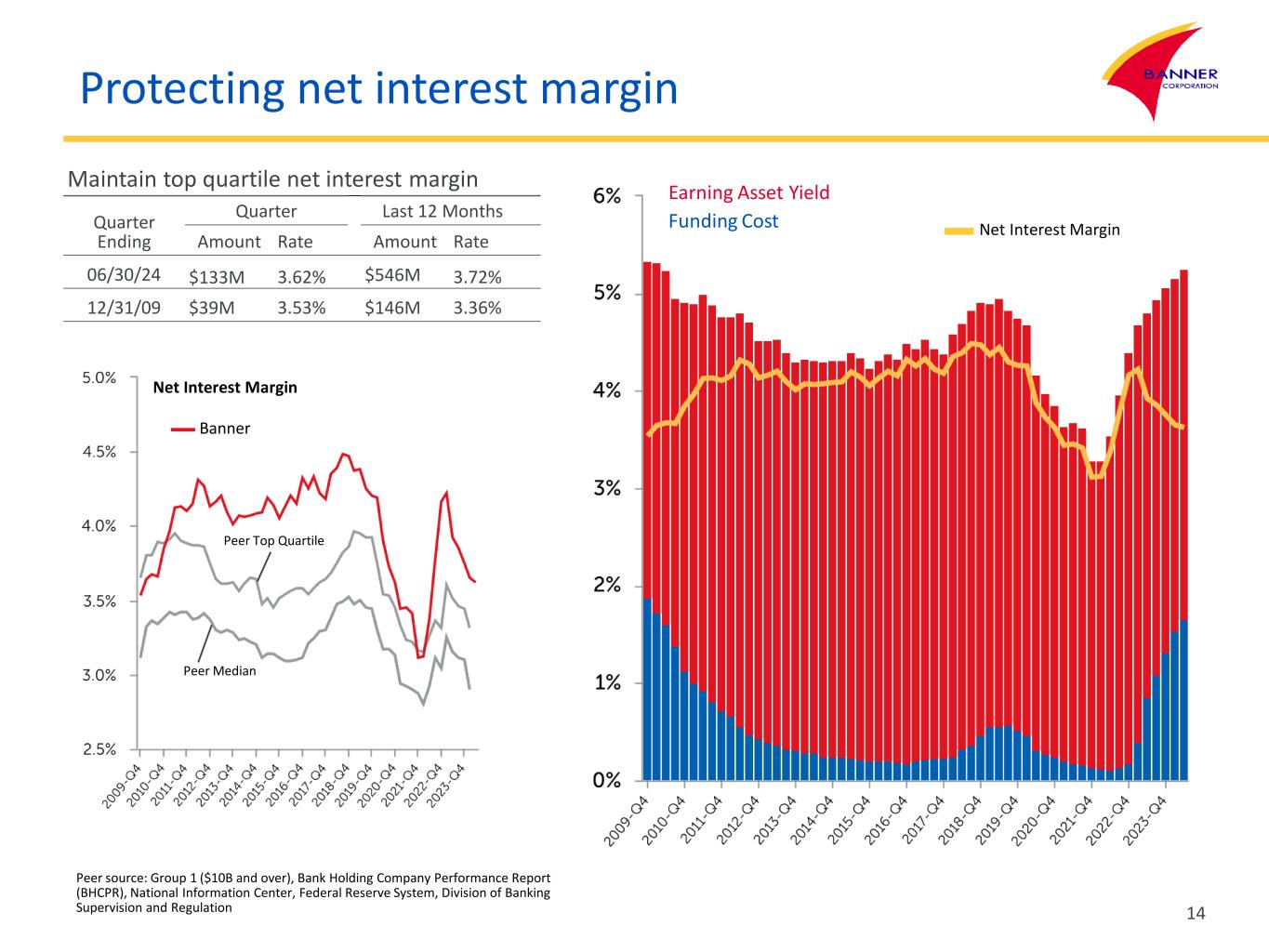 Protecting net interest margin Peer Median Peer source: Group 1 ($10B and over), Bank Holding Company Performance Report (BHCPR), National Information Center, Federal Reserve System, Division of Banking Supervision and Regulation Net Noncore Funding Dependence Peer Top Quartile 13 Banner Loan-to-Deposit Ratio Deposits Loans