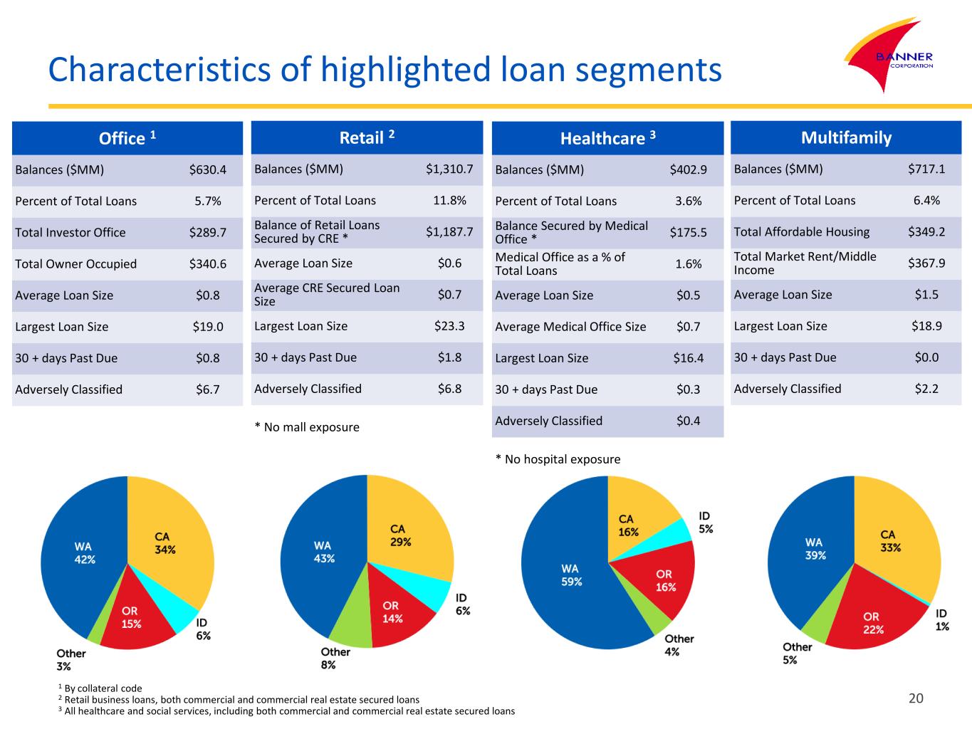 21 Origination Year Portfolio Segment Balance % Owner Occupied 2024 2023 2022 2021 and earlier Office $630.4 54% $13.8 $41.2 $79.1 $496.4 Retail (CRE Secured) $1,187.7 51% $76.6 $130.9 $185.6 $794.5 Medical Office $175.5 46% $6.7 $9.1 $25.5 $134.2 Multifamily $717.1 0% $4.0 $63.4 $114.0 $535.8 Scheduled Maturity or Next Reprice Date (excludes variable rate loans) Portfolio Segment Balance < 12 months 1 - 2 years 2 - 3 years 3 - 5 years > 5 years Office $630.4 $38.0 $81.3 $123.8 $165.0 $161.7 Retail (CRE Secured) $1,187.7 $116.9 $126.8 $192.8 $321.7 $228.2 Medical Office $175.5 $5.6 $23.9 $21.3 $39.4 $43.0 Multifamily $717.1 $11.1 $67.3 $144.7 $98.3 $342.3 Characteristics of highlighted loan segments