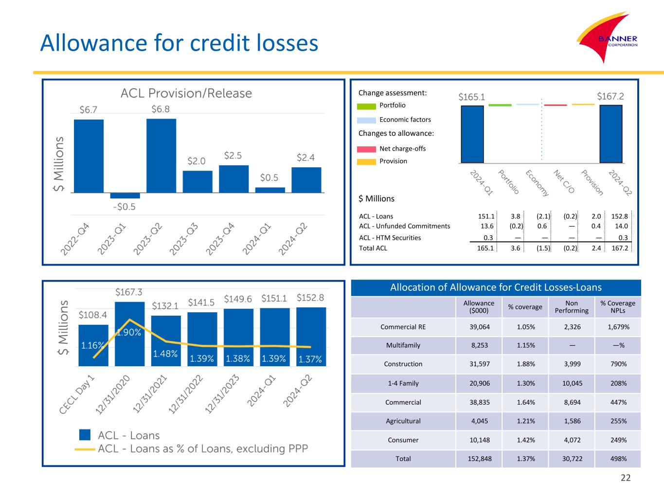 Allowance for credit losses 22 Net charge-offs Portfolio Economic factors Provision Change assessment: Changes to allowance: $ Millions ACL - Loans 151.1 3.8 (2.1) (0.2) 2.0 152.8 ACL - Unfunded Commitments 13.6 (0.2) 0.6 — 0.4 14.0 ACL - HTM Securities 0.3 — — — — 0.3 Total ACL 165.1 3.6 (1.5) (0.2) 2.4 167.2 Allocation of Allowance for Credit Losses-Loans Allowance ($000) % coverage Non Performing % Coverage NPLs Commercial RE 39,064 1.05% 2,326 1,679% Multifamily 8,253 1.15% — —% Construction 31,597 1.88% 3,999 790% 1-4 Family 20,906 1.30% 10,045 208% Commercial 38,835 1.64% 8,694 447% Agricultural 4,045 1.21% 1,586 255% Consumer 10,148 1.42% 4,072 249% Total 152,848 1.37% 30,722 498%