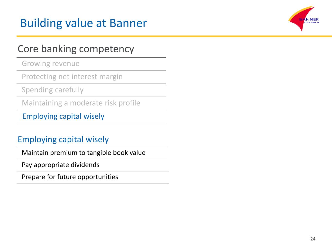 Building value at Banner Core banking competency Growing revenue Protecting net interest margin Spending carefully Maintaining a moderate risk profile Employing capital wisely Employing capital wisely Maintain premium to tangible book value Pay appropriate dividends Prepare for future opportunities 24