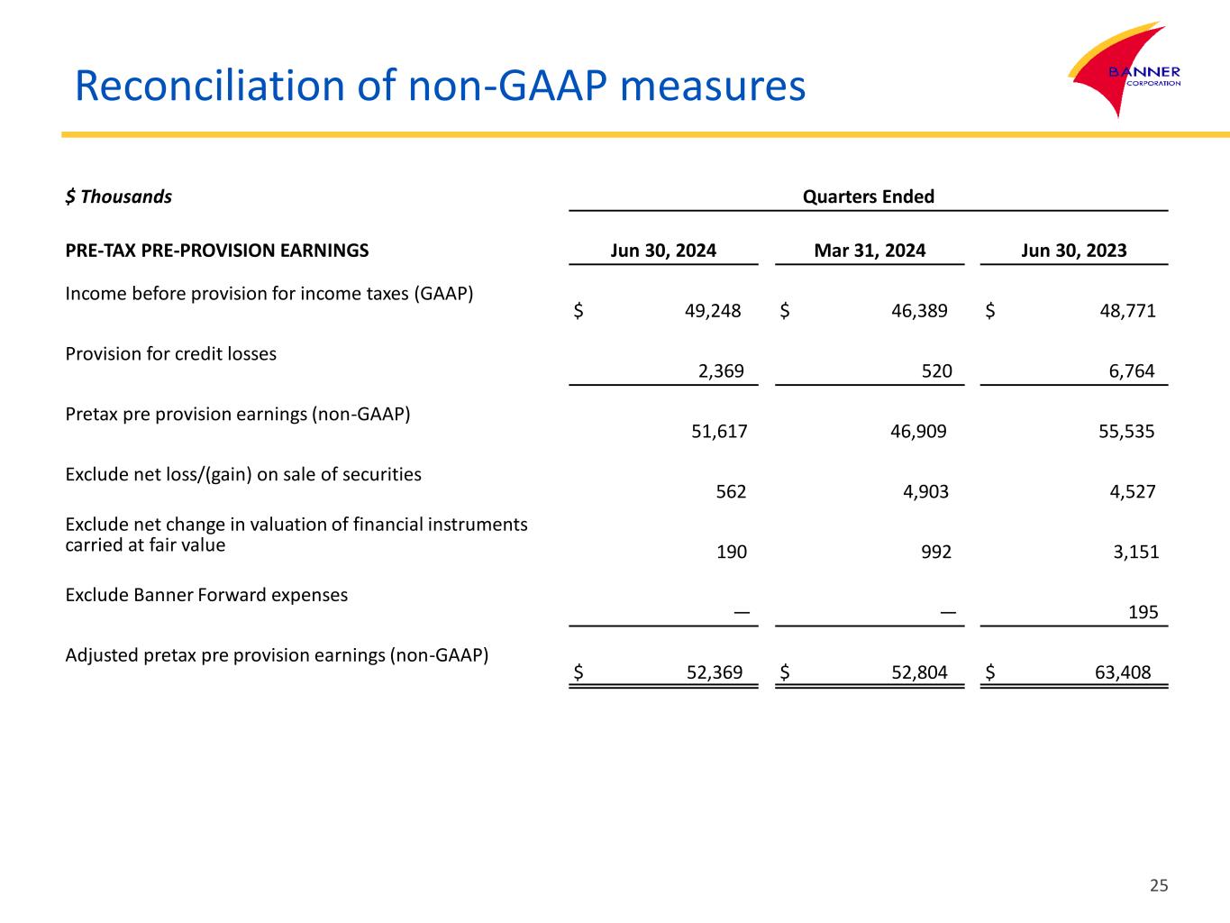 Reconciliation of non-GAAP measures 25 $ Thousands Quarters Ended PRE-TAX PRE-PROVISION EARNINGS Jun 30, 2024 Mar 31, 2024 Jun 30, 2023 Income before provision for income taxes (GAAP) $ 49,248 $ 46,389 $ 48,771 Provision for credit losses 2,369 520 6,764 Pretax pre provision earnings (non-GAAP) 51,617 46,909 55,535 Exclude net loss/(gain) on sale of securities 562 4,903 4,527 Exclude net change in valuation of financial instruments carried at fair value 190 992 3,151 Exclude Banner Forward expenses — — 195 Adjusted pretax pre provision earnings (non-GAAP) $ 52,369 $ 52,804 $ 63,408