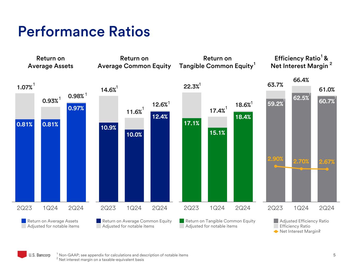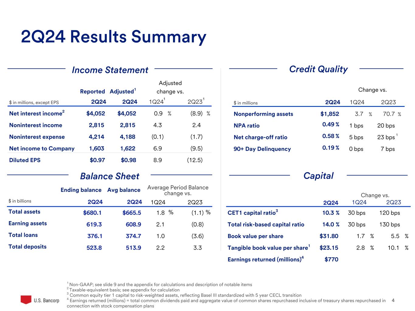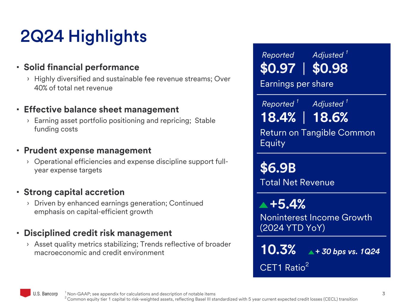 | PROFITABILITY METRICS | 2Q24 | 1Q24 | 2Q23 | | | | •Net income of $1,622 million and diluted earnings per common share of $0.98, both as adjusted for a $26 million notable item for an increase in the Federal Deposit Insurance Corporation ("FDIC") special assessment •Net interest income, linked quarter, increased 0.9% on a taxable-equivalent basis •Average total loans increased 1.0% and average total deposits increased 2.2% on a linked quarter basis •Noninterest income increased 2.4% from the second quarter of a year ago and increased 4.3% on a linked quarter basis, as adjusted •Net revenue of $6,867 million, including $4,052 million of net interest income on a taxable-equivalent basis •Noninterest expense decreased 1.7% year-over-year and 0.1% on a linked quarter basis, as adjusted •Return on tangible common equity of 18.6%, return on average assets of 0.98%, and efficiency ratio of 60.7%, each as adjusted •CET1 capital ratio of 10.3% at June 30, 2024, compared with 10.0% at March 31, 2024