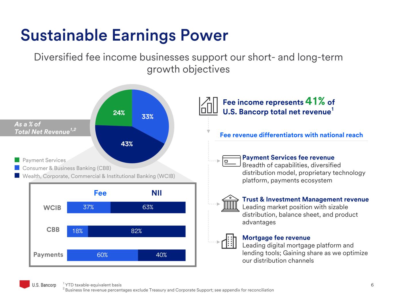 U.S. Bancorp 5 Performance Ratios 1 Non-GAAP; see appendix for calculations and description of notable items 2 Net interest margin on a taxable-equivalent basis 1.07% 0.93% 0.98% 0.81% 0.81% 0.97% Return on Average Assets Adjusted for notable items 2Q23 1Q24 2Q24 14.6% 11.6% 12.6% 10.9% 10.0% 12.4% Return on Average Common Equity Adjusted for notable items 2Q23 1Q24 2Q24 22.3% 17.4% 18.6% 17.1% 15.1% 18.4% Return on Tangible Common Equity Adjusted for notable items 2Q23 1Q24 2Q24 63.7% 66.4% 61.0% 59.2% 62.5% 60.7% 2.90% 2.70% 2.67% Adjusted Efficiency Ratio Efficiency Ratio Net Interest Margin 2Q23 1Q24 2Q24 Return on Average Assets Return on Average Common Equity Return on Tangible Common Equity1 Efficiency Ratio1 & Net Interest Margin 2 1 1 1 1 1 1 1 1 1 1 1 1 2