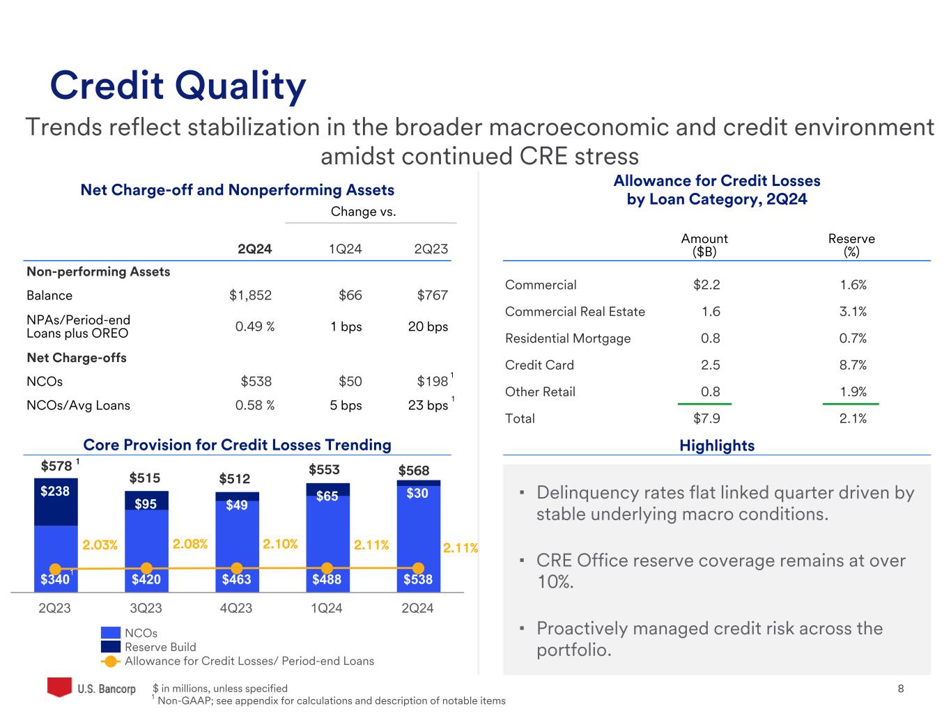 U.S. Bancorp 7 $497 $512 $503 $503 $514 12.3% 14.3% 7.1% 6.4% 1.6% 39.4% 45.8% 48.6% 51.0% 52.1% Noninterest-Bearing (NIB) Interest-Bearing Chg in NIB balance (QoQ) Total Deposit Beta 2Q23 3Q23 4Q23 1Q24 2Q24 Balance Sheet Summary Effective balance sheet management and stabilizing deposit trends Total Average Deposits Highlights Total Average Loans $389 $377 $373 $371 $375 5.79% 6.02% 6.13% 6.20% 6.19% Average Balance Avg Yield % 2Q23 3Q23 4Q23 1Q24 2Q24 Investment Portfolio End of Period Balances $ in billions 1 Cumulative deposit beta cycle to date measured from 4Q21 2 Balances exclude unrealized gains (losses) ▪ Core deposit levels remain stable; Total noninterest bearing mix shift continues to slow. ▪ Meaningful year-over-year improvement in both the loan book and Investment Portfolio yield (40 bps increase each). ▪ Linked quarter Investment Portfolio yield increase driven by cash balance positioning and reinvestment of qtrly runoff. $164 $162 $161 $162 $168 2.75% 2.87% 2.97% 2.96% 3.15% Ending Balance Avg Yield % 2Q23 3Q23 4Q23 1Q24 2Q24 ( 2 ) ( ) ( ) ( ) ( ) 1