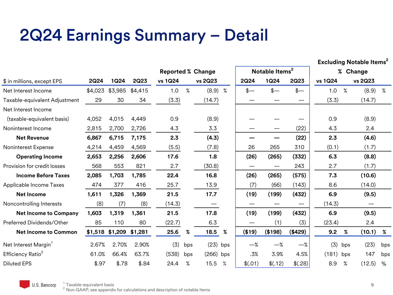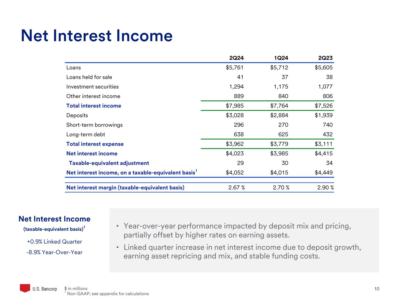 U.S. Bancorp 9 Excluding Notable Items2 Reported % Change Notable Items2 % Change $ in millions, except EPS 2Q24 1Q24 2Q23 vs 1Q24 vs 2Q23 2Q24 1Q24 2Q23 vs 1Q24 vs 2Q23 Net Interest Income $4,023 $3,985 $4,415 1.0 % (8.9) % $— $— $— 1.0 % (8.9) % Taxable-equivalent Adjustment 29 30 34 (3.3) (14.7) — — — (3.3) (14.7) Net Interest Income (taxable-equivalent basis) 4,052 4,015 4,449 0.9 (8.9) — — — 0.9 (8.9) Noninterest Income 2,815 2,700 2,726 4.3 3.3 — — (22) 4.3 2.4 Net Revenue 6,867 6,715 7,175 2.3 (4.3) — — (22) 2.3 (4.6) Noninterest Expense 4,214 4,459 4,569 (5.5) (7.8) 26 265 310 (0.1) (1.7) Operating Income 2,653 2,256 2,606 17.6 1.8 (26) (265) (332) 6.3 (8.8) Provision for credit losses 568 553 821 2.7 (30.8) — — 243 2.7 (1.7) Income Before Taxes 2,085 1,703 1,785 22.4 16.8 (26) (265) (575) 7.3 (10.6) Applicable Income Taxes 474 377 416 25.7 13.9 (7) (66) (143) 8.6 (14.0) Net Income 1,611 1,326 1,369 21.5 17.7 (19) (199) (432) 6.9 (9.5) Noncontrolling Interests (8) (7) (8) (14.3) — — — — (14.3) — Net Income to Company 1,603 1,319 1,361 21.5 17.8 (19) (199) (432) 6.9 (9.5) Preferred Dividends/Other 85 110 80 (22.7) 6.3 — (1) (3) (23.4) 2.4 Net Income to Common $1,518 $1,209 $1,281 25.6 % 18.5 % ($19) ($198) ($429) 9.2 % (10.1) % Net Interest Margin1 2.67% 2.70% 2.90% (3) bps (23) bps —% —% —% (3) bps (23) bps Efficiency Ratio2 61.0% 66.4% 63.7% (538) bps (266) bps .3% 3.9% 4.5% (181) bps 147 bps Diluted EPS $.97 $.78 $.84 24.4 % 15.5 % $(.01) $(.12) $(.28) 8.9 % (12.5) % 1 Taxable-equivalent basis 2 Non-GAAP; see appendix for calculations and description of notable items 2Q24 Earnings Summary – Detail