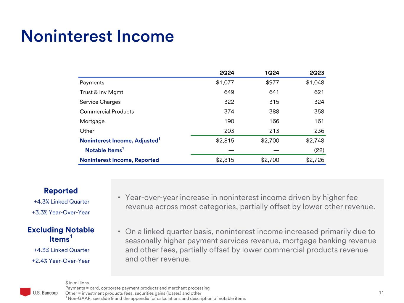 U.S. Bancorp 10 ▪ Year-over-year performance impacted by deposit mix and pricing, partially offset by higher rates on earning assets. ▪ Linked quarter increase in net interest income due to deposit growth, earning asset repricing and mix, and stable funding costs. $ in millions 1 Non-GAAP; see appendix for calculations 2Q24 1Q24 2Q23 Loans $5,761 $5,712 $5,605 Loans held for sale 41 37 38 Investment securities 1,294 1,175 1,077 Other interest income 889 840 806 Total interest income $7,985 $7,764 $7,526 Deposits $3,028 $2,884 $1,939 Short-term borrowings 296 270 740 Long-term debt 638 625 432 Total interest expense $3,962 $3,779 $3,111 Net interest income $4,023 $3,985 $4,415 Taxable-equivalent adjustment 29 30 34 Net interest income, on a taxable-equivalent basis1 $4,052 $4,015 $4,449 Net interest margin (taxable-equivalent basis) 2.67 % 2.70 % 2.90 % Net Interest Income (taxable-equivalent basis)1 +0.9% Linked Quarter -8.9% Year-Over-Year Net Interest Income