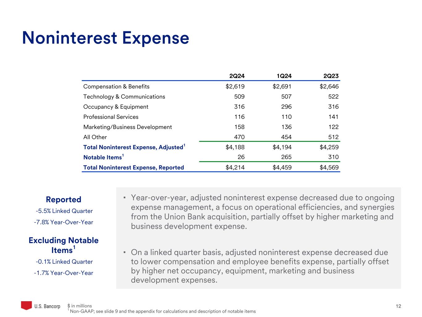 U.S. Bancorp 11 ▪ Year-over-year increase in noninterest income driven by higher fee revenue across most categories, partially offset by lower other revenue. ▪ On a linked quarter basis, noninterest income increased primarily due to seasonally higher payment services revenue, mortgage banking revenue and other fees, partially offset by lower commercial products revenue and other revenue. $ in millions Payments = card, corporate payment products and merchant processing Other = investment products fees, securities gains (losses) and other 1 Non-GAAP; see slide 9 and the appendix for calculations and description of notable items 2Q24 1Q24 2Q23 Payments $1,077 $977 $1,048 Trust & Inv Mgmt 649 641 621 Service Charges 322 315 324 Commercial Products 374 388 358 Mortgage 190 166 161 Other 203 213 236 Noninterest Income, Adjusted1 $2,815 $2,700 $2,748 Notable Items1 — — (22) Noninterest Income, Reported $2,815 $2,700 $2,726 Noninterest Income Reported +4.3% Linked Quarter +3.3% Year-Over-Year Excluding Notable Items1 +4.3% Linked Quarter +2.4% Year-Over-Year
