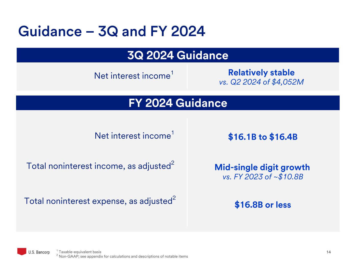 U.S. Bancorp 141 Taxable-equivalent basis 2 Non-GAAP; see appendix for calculations and descriptions of notable items 3Q 2024 Guidance Mid-single digit growth vs. FY 2023 of ~$10.8B Net interest income1 FY 2024 Guidance Net interest income1 Total noninterest expense, as adjusted2 Total noninterest income, as adjusted2 $16.8B or less $16.1B to $16.4B Guidance – 3Q and FY 2024 Relatively stable vs. Q2 2024 of $4,052M