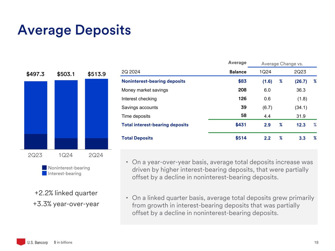 U.S. Bancorp 17 $388.8 $371.1 $374.7 2Q 2023 1Q 2024 2Q 2024 Average Loans +1.0% linked quarter -3.6% year-over-year $ in billions ▪ On a year-over-year basis, average total loans decline was driven by lower commercial, commercial real estate, and other retail loans, partially offset by higher credit card loans. ▪ On a linked quarter basis, average total loans increase was driven by higher commercial loans and credit card loans, partially offset by lower total commercial real estate loans and other retail loans. Average % of Average Change vs. 2Q 2024 Balance Total 1Q24 2Q23 Commercial $134 36% 2.7 % (2.7) % Commercial Real Estate 52 14% (1.4) (4.8) Residential Mortgages 117 31% 0.7 (1.0) Credit Card 29 8% 1.5 8.8 Other Retail 43 11% (1.0) (17.1) Total Loans $375 1.0 % (3.6) %